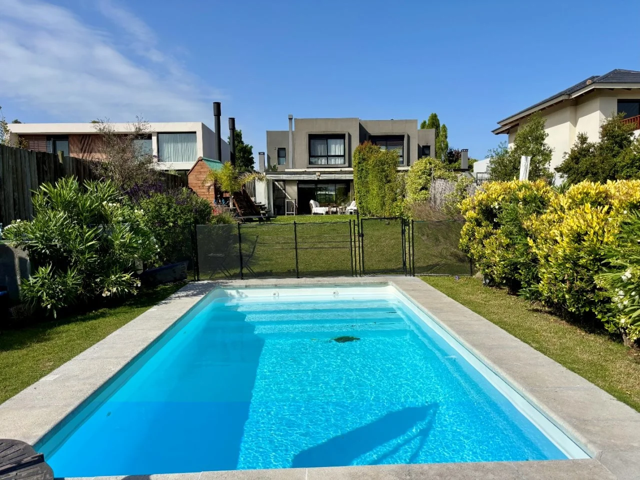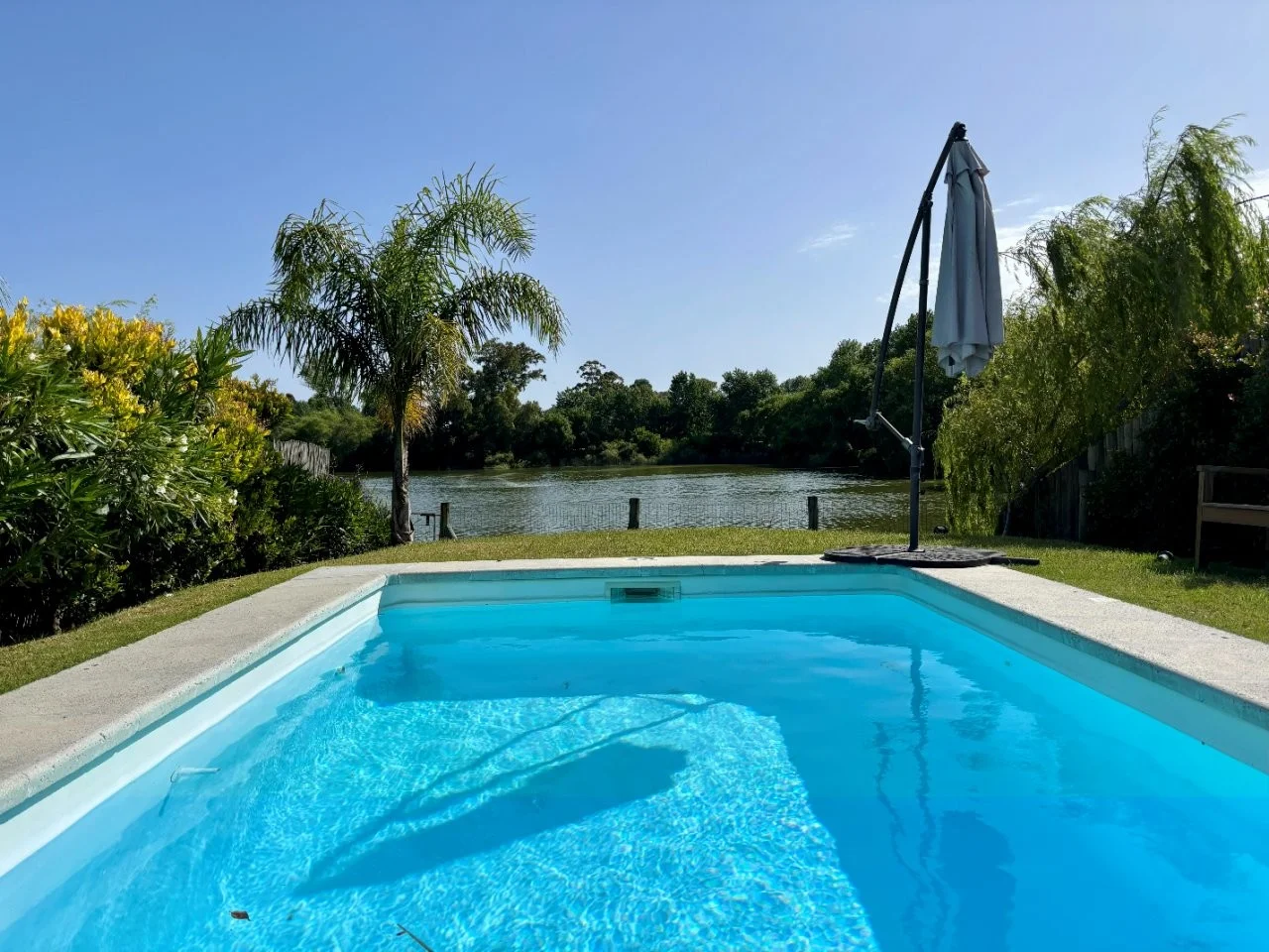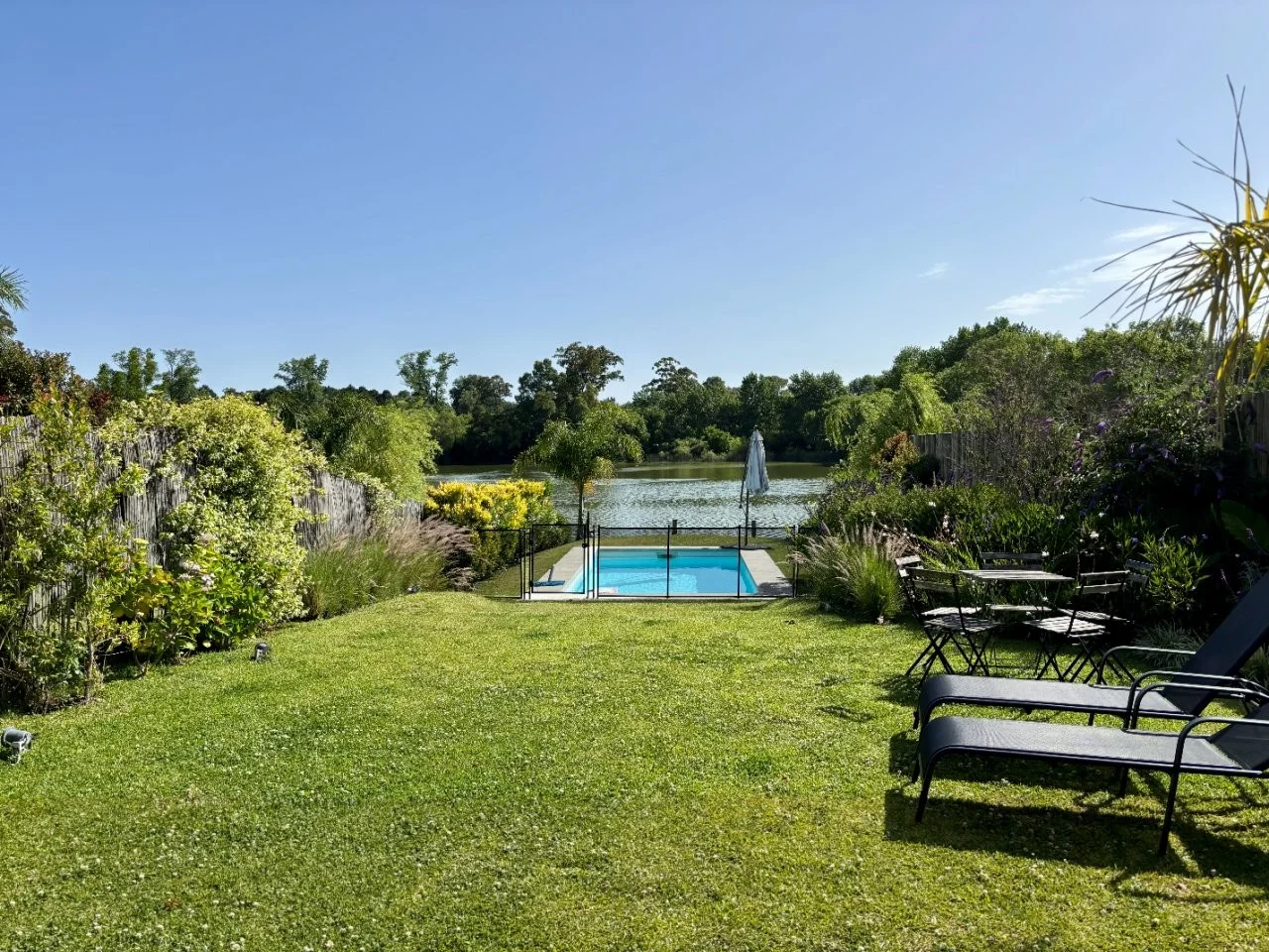 Salida a pérgola con parrillero, fondo verde amplio, con piscina climatizada y acceso al lago.