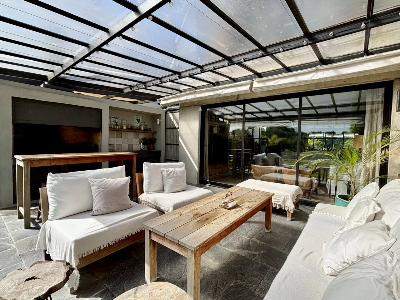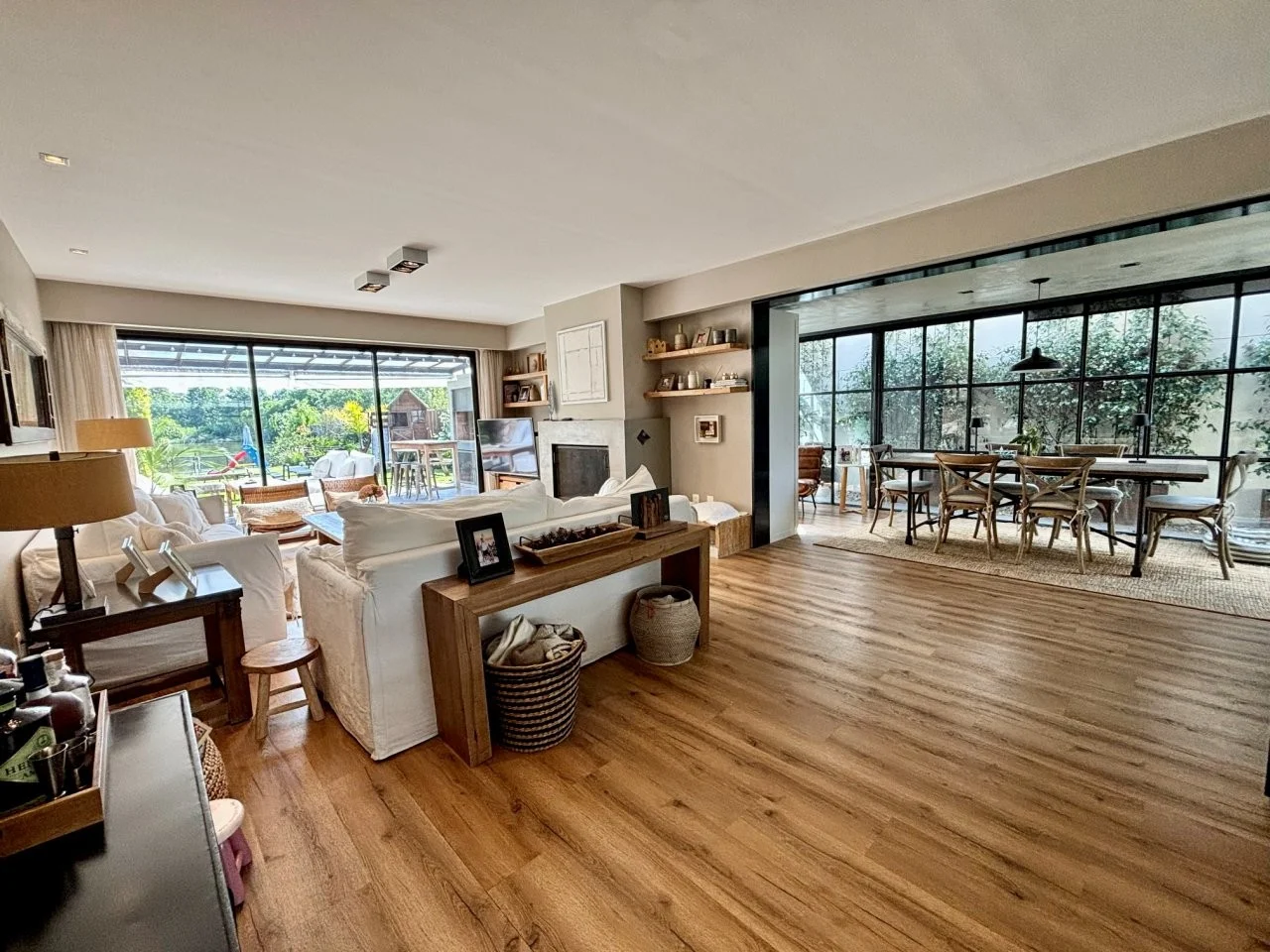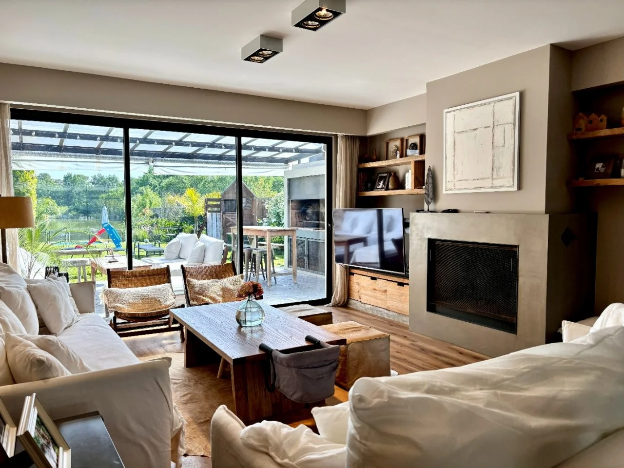 Salida a pérgola con parrillero, fondo verde amplio, con piscina climatizada y acceso al lago.