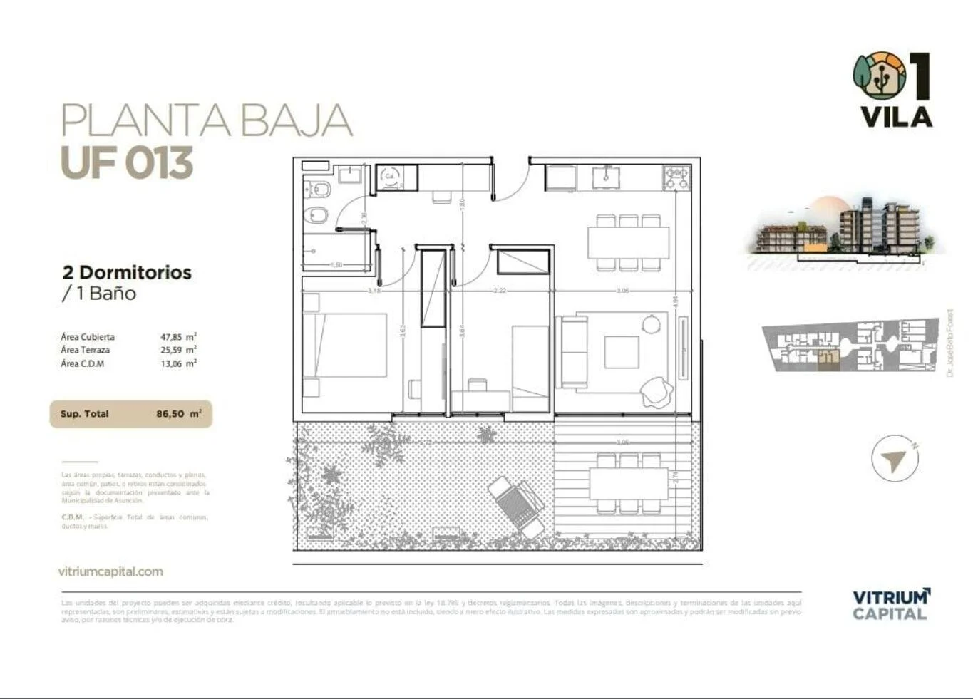 Con una superficie total de 86,50 m², la unidad combina de manera inteligente espacios interiores y exteriores: