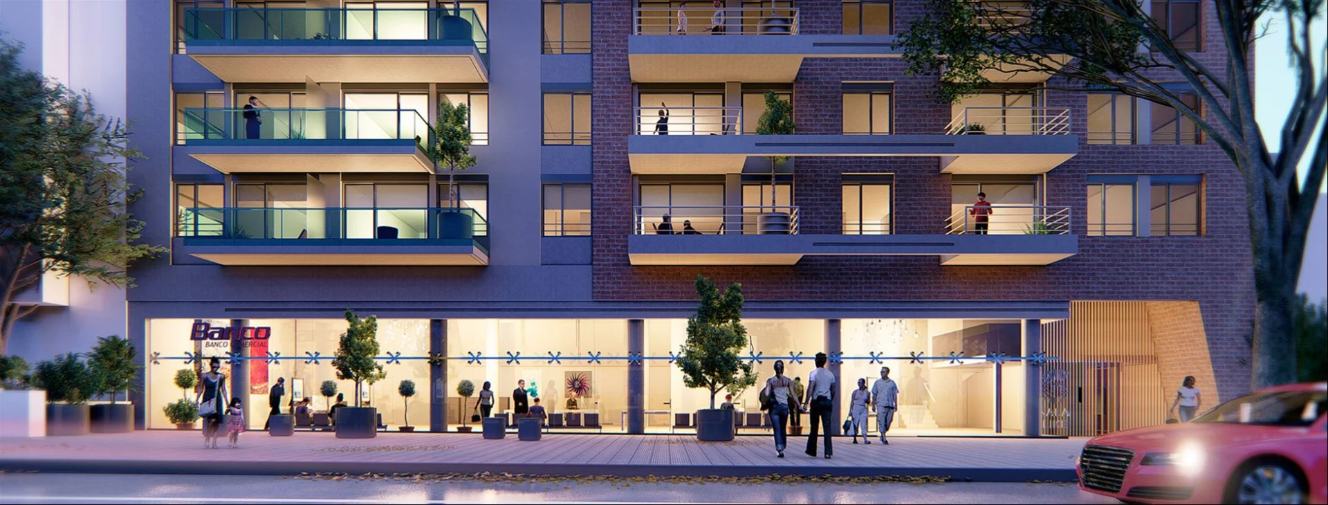 Como diferencial el mismo posee plantaciones de árboles que emergen al patio verde y posibilitan el ingreso de luz natural y ventilación. Sobre el Bv. Artigas se encuentra un local de dimensiones poco frecuente. Con un frente vidriado de más de 26 metros y una superficie superior a los 370m2. También sobre calle Miguelete se ubica otro local de 45m2.Todas las unidades se entregan con placares terminados.