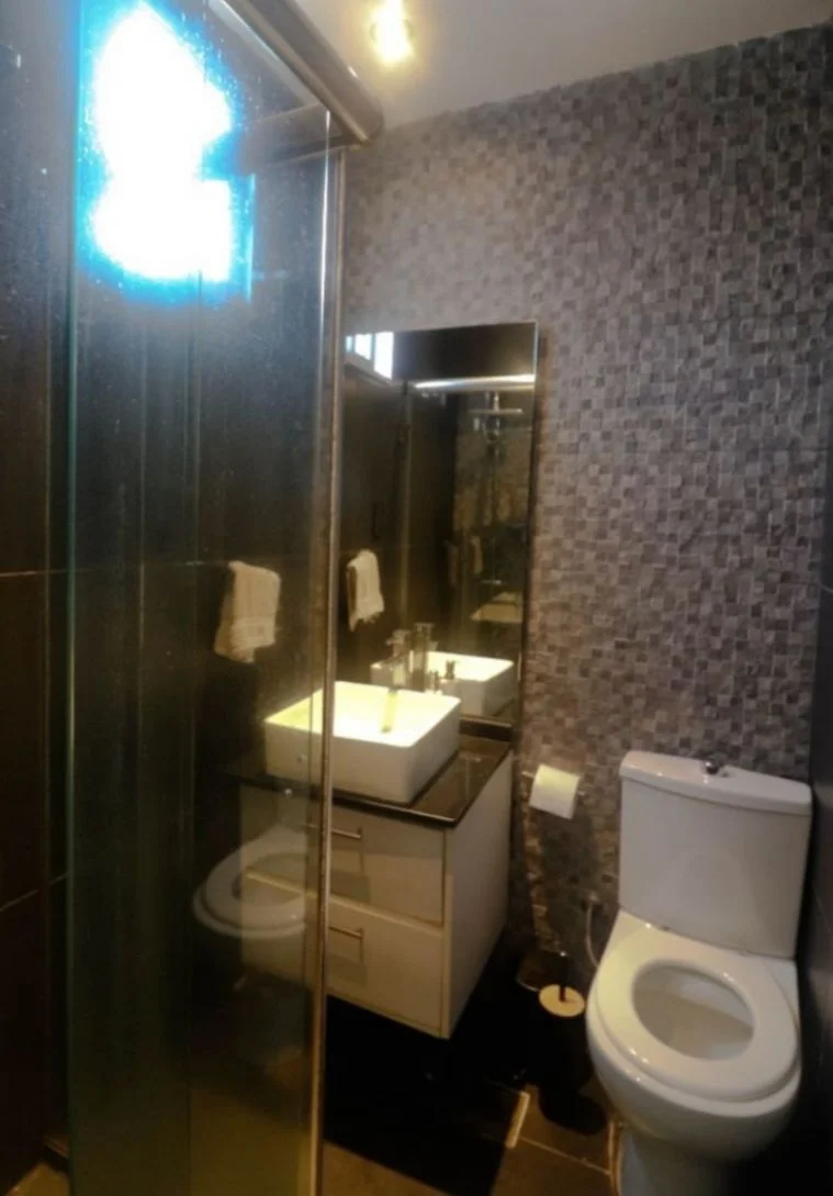 El baño tiene una decoración moderna e incluye mampara de vidrio templado.