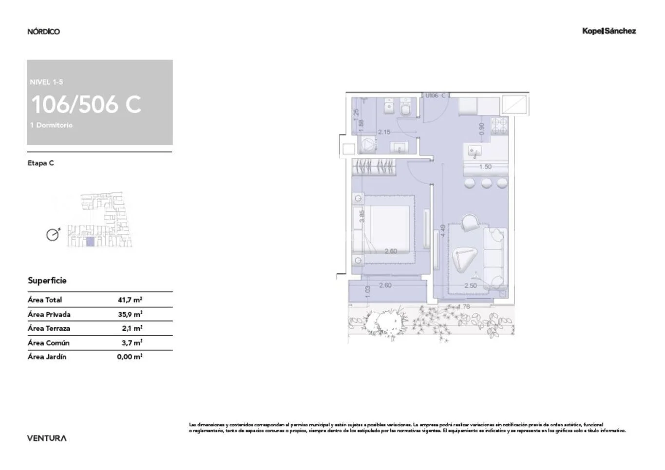 106 a 506) 35,9m área propia + 2,1m terraza + 3,7m área común = Total 41,7m.