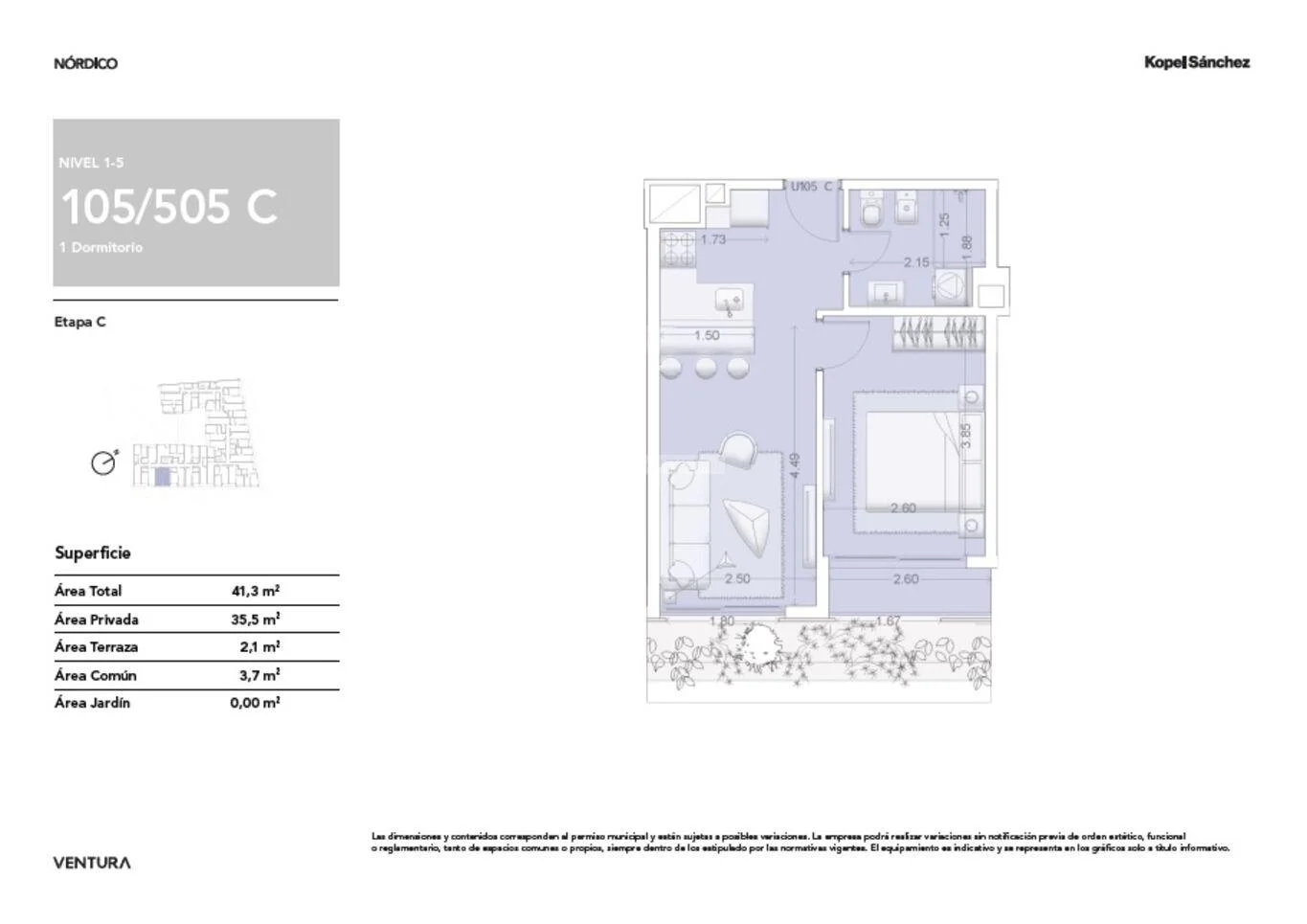 105 a 505) 35,5m área propia + 2,1m terraza + 3,7m área común = Total 41,3m.