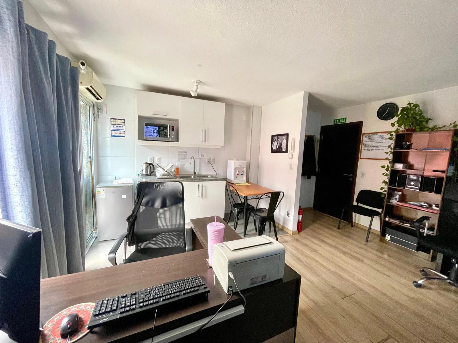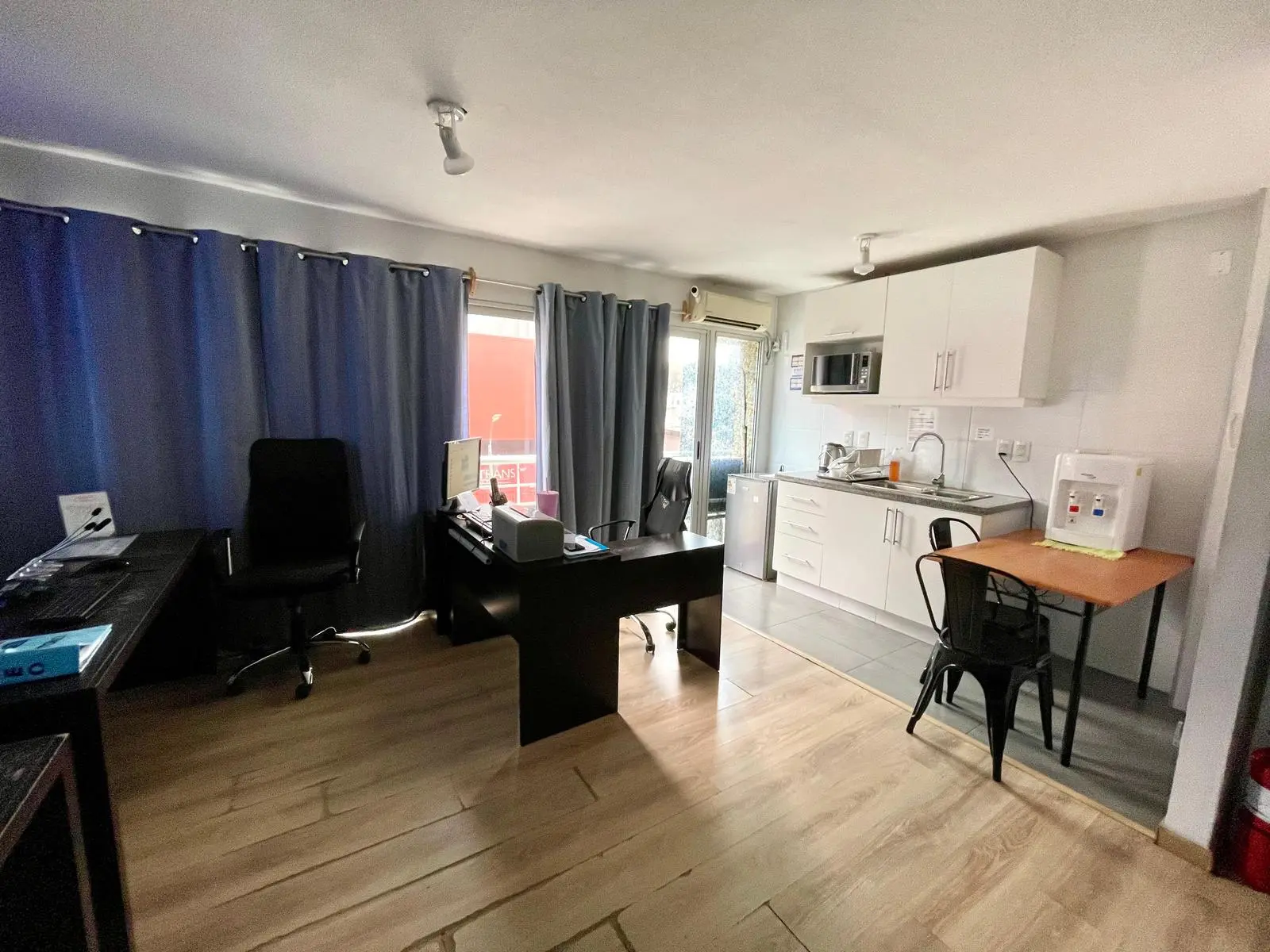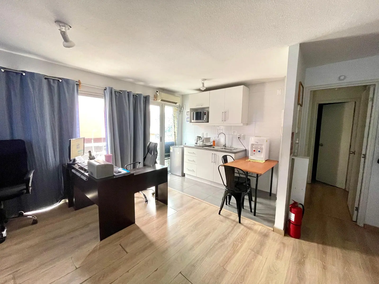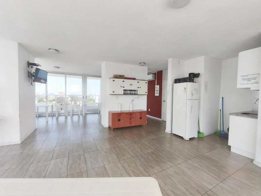 - Living comedor con cocina integrada y muebles bajos y sobre mesada,
