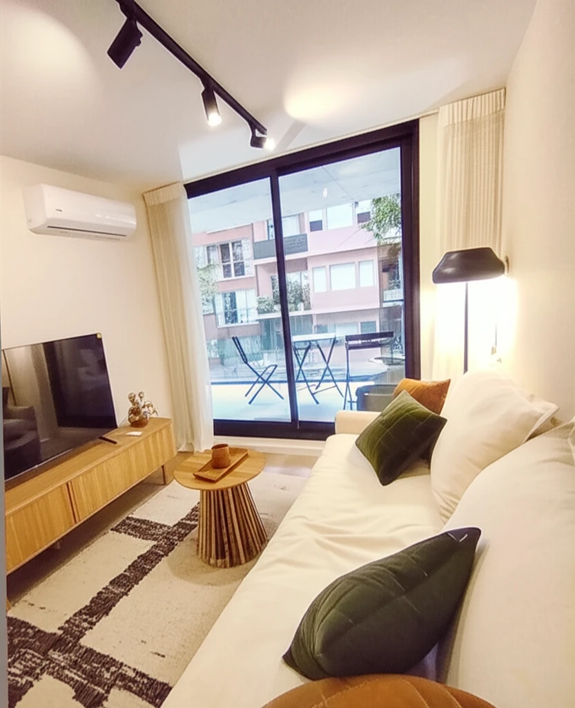 Detalles: 1 dormitorio con placard, cocina integrada de alta calidad ( incluye horno, anafe y campana), conexión para lavarropas y calefón, baño completo y un amplio patio de uso exclusivo de 65m² con parrillero.