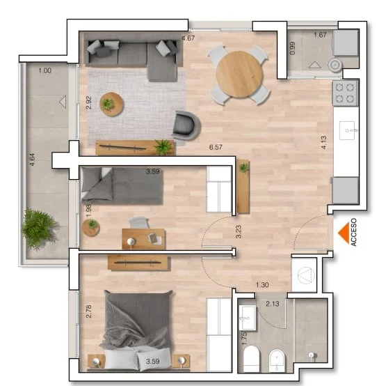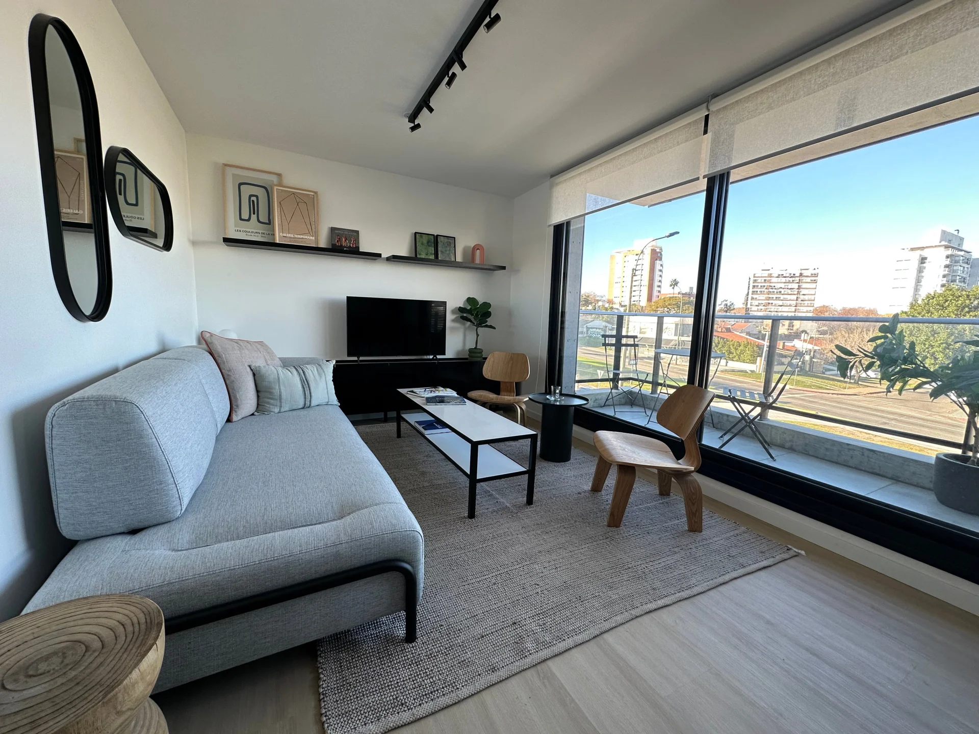La unidad se sitúa en el piso 18, en contrafrente lateral, con orientación norte y oeste. Cuenta con un living comedor luminoso con salida a balcón y terraza, cocina semi integrada con terraza lavadero, dos dormitorios con buena luz natural y un baño completo. Se entrega equipado con aire acondicionado en el living, anafe y campana extractora.