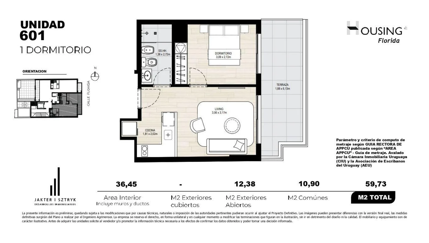 METRAJE: 36,45m2 área propia + 10,90m2 área comun + 12,38m2 terraza = 59,73m2 totales.