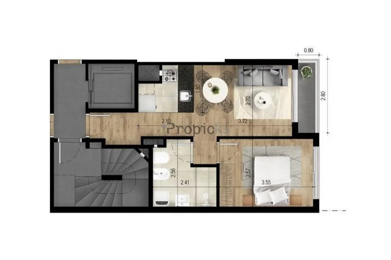 Se trata de una unidad en séptimo piso al contrafrente, con una superficie total de 46 m², que combina diseño contemporáneo, excelente iluminación natural y una distribución funcional. El apartamento cuenta con un living-comedor de 3,72 × 2,70 m, cocina integrada de 2,10 × 1,80 m, dormitorio definido de 3,55 × 2,57 m, baño completo de 2,41 × 2,56 m, y terraza de 0,80 × 2,80 m. Además, incluye cochera, un diferencial cada vez más valorado en la zona.