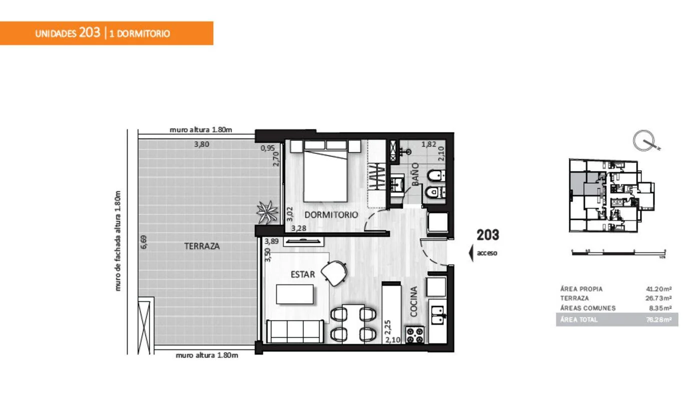 203) 41,20m2 área propia c/muros + 8,35m2 área común + 26,73m2 terraza = 76,28m2 totales.
