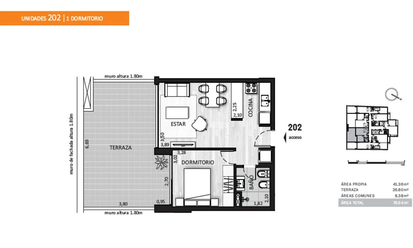 202) 41,36m2 área propia c/muros + 8,38m2 área común + 26,80m2 terraza = 76,54m2 totales.