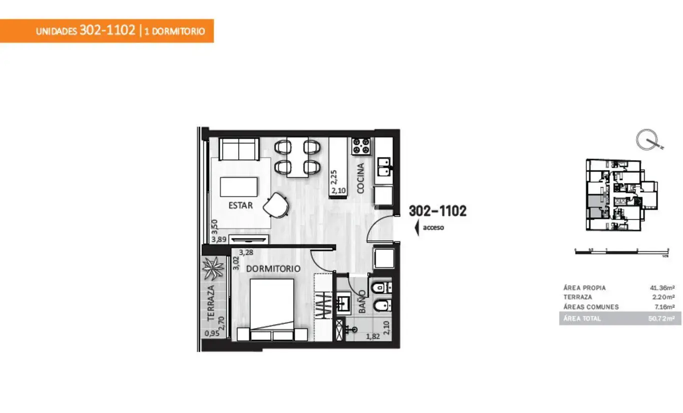 302 a 1102) 41,36m2 área propia c/muros + 7,16m2 área común + 2,20m2 terraza = 50,72m2 totales.
