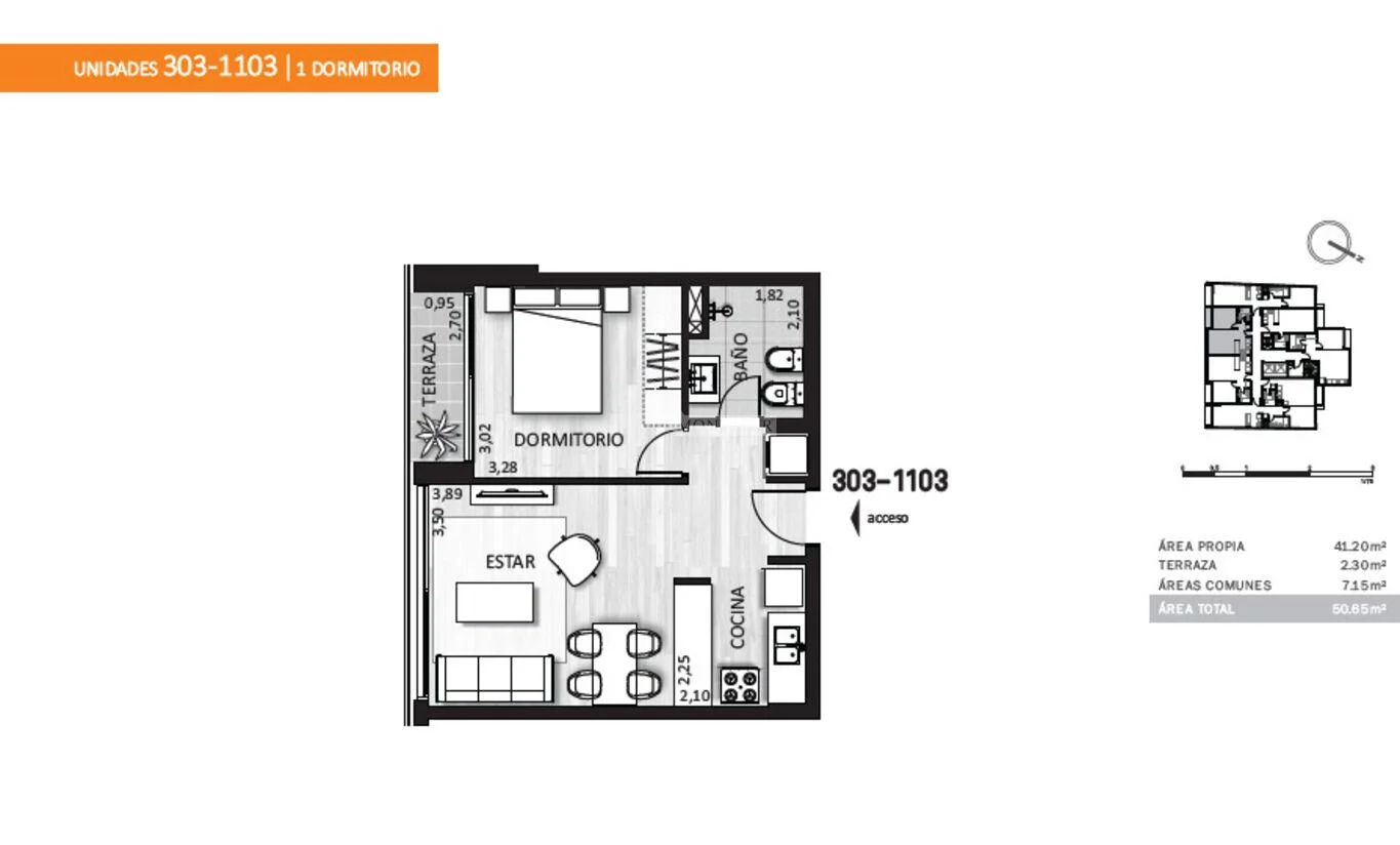 303 a 1103) 41,20m2 área propia c/muros + 7,16m2 área común + 2,30m2 terraza = 50,65m2 totales.