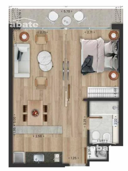 Living comedor con acceso a terraza de uso exclusivo. Cocina integrada con muebles sobre y bajo mesada, anafe vitrocerámico con 2 hornallas, campana instalada, y previsión para horno eléctrico empotrado. Baño completo. 1 Dormitorio.