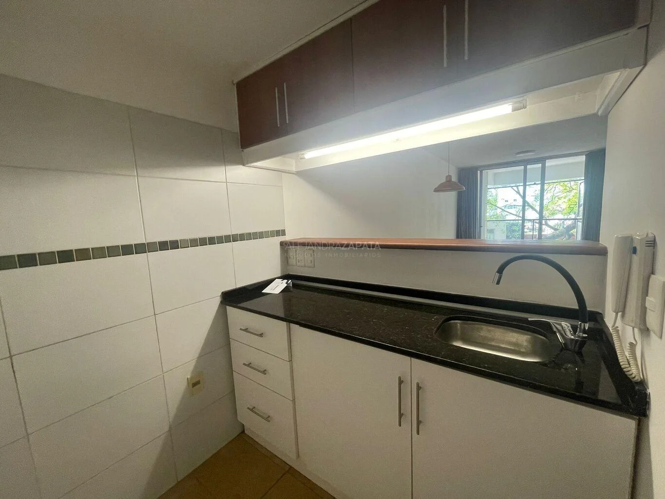 Cocina integrada con barra desayunadora. Buena capacidad de placares sobre y bajo mesada.