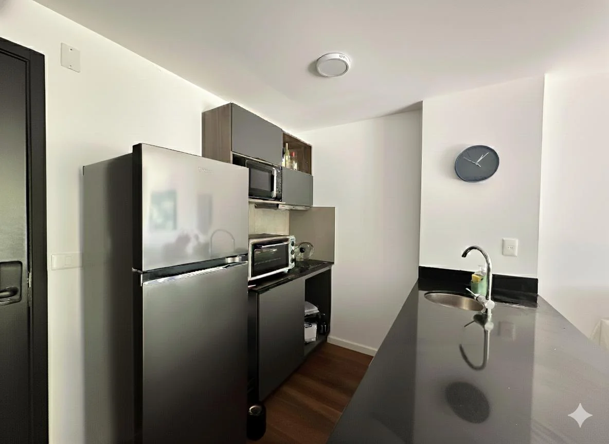 El apartamento cuenta con un cómodo estar-comedor que se conecta a una linda terraza, ideal para disfrutar del aire libre del sol. La cocina, diseñada para ser práctica y eficiente, está integrada al área social.