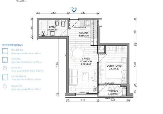 Primer piso al lateral, living comedor con cocina integrada mediante barra.