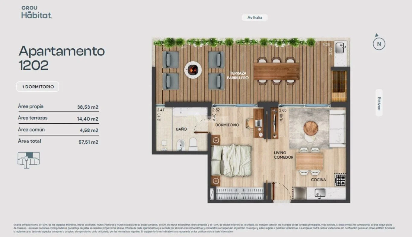 AVENIDA ITALIA Y ESTIVAO... EDIFICIO GROU HÁBITAT...A PASOS DEL DISCO DE AVENIDA ITALIA Y PROXIMO SODIMAC Y PLAZA ITALIA SHOPPING NACE UN EDIFICIO DE DISEÑO, UN HABITAT PENSADO PARA LA NUEVA ERA... ESTRENA JUNIO 2026... AL FRENTE... PENTHOUSE CON PARRILLERO... Living comedor con cocina integrada con placares aéreos y bajo mesada, salida a TERRAZA con PARRILLERO. 1 DORMITORIO con placard y salida a la TERRAZA. 1 BAÑO completo. Previsión para aire acondicionado. El edificio cuenta con TERRAZA CON BARBACOA Y PARRILLERO, GIMNASIO, BICICLETERO, LAUNDRY, CO WORK, PLAYROOM Y PATIO ZEN. GARAJE OPCIONAL.