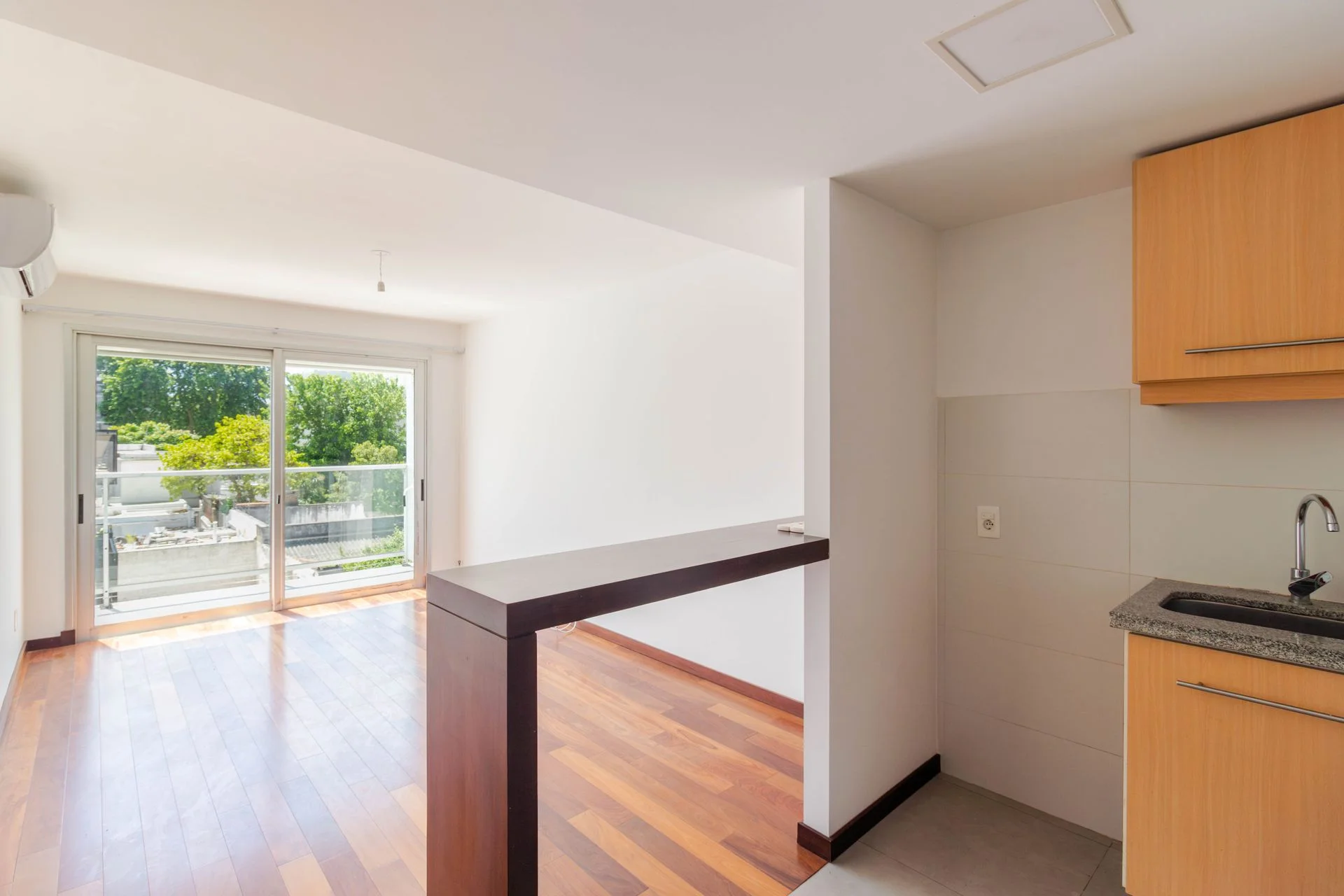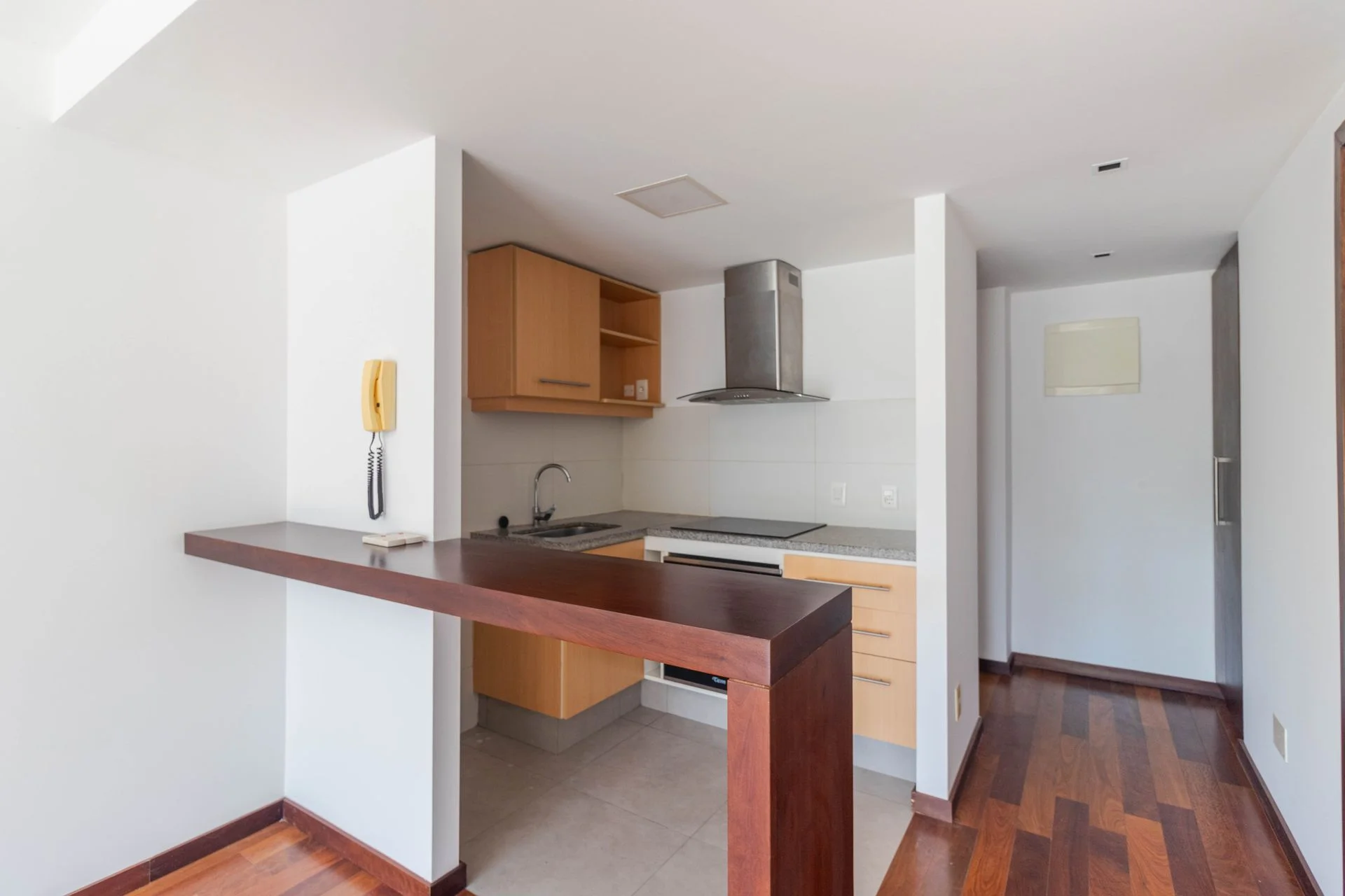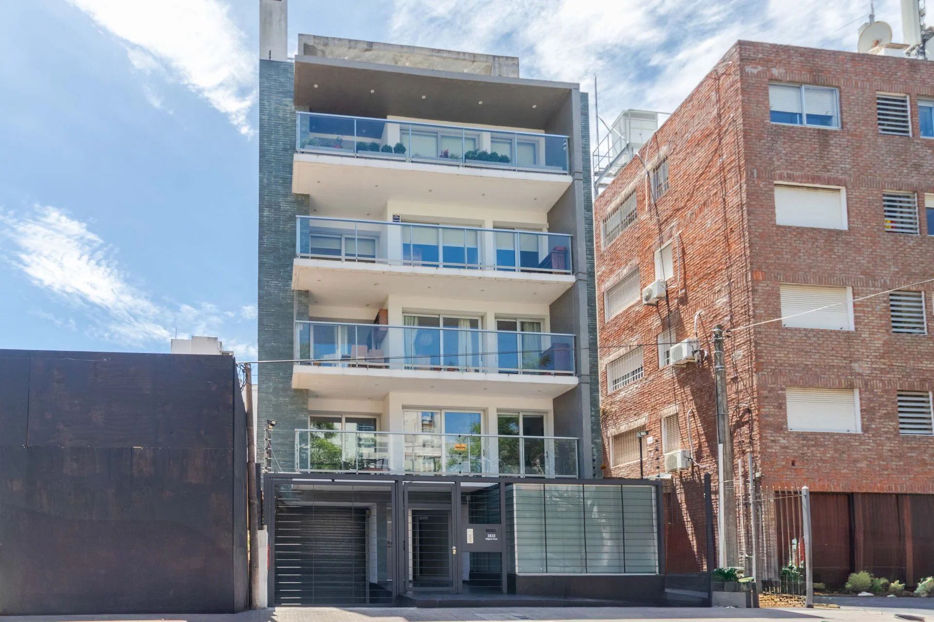El edificio cuenta con 4 pisos, y el apartamento se encuentra en el 4º piso (unidad 403). Tiene 46mt2 (39mt2 interiores y 7m2 de balcón). Cuenta con un living comedor, con cocina integrada con una cómoda barra de madera. El living tiene un gran ventanal con salida a un amplio balcón, ideal para agregar un juego de mesa exterior. El living cuenta con aire acondicionado. El ventanal cuenta con toldo roller para el sol.