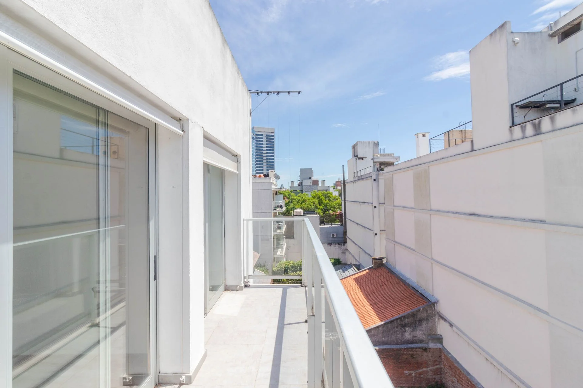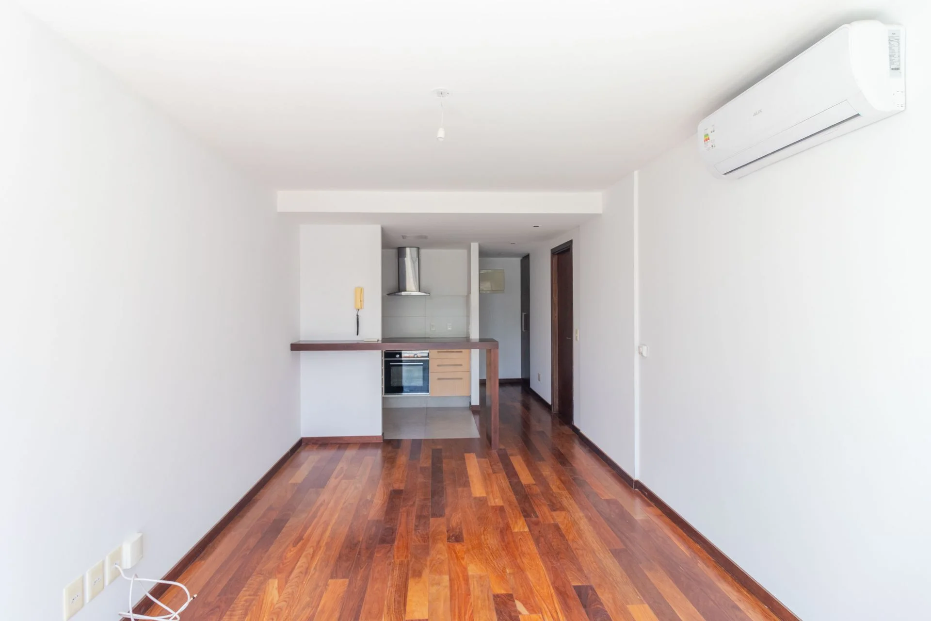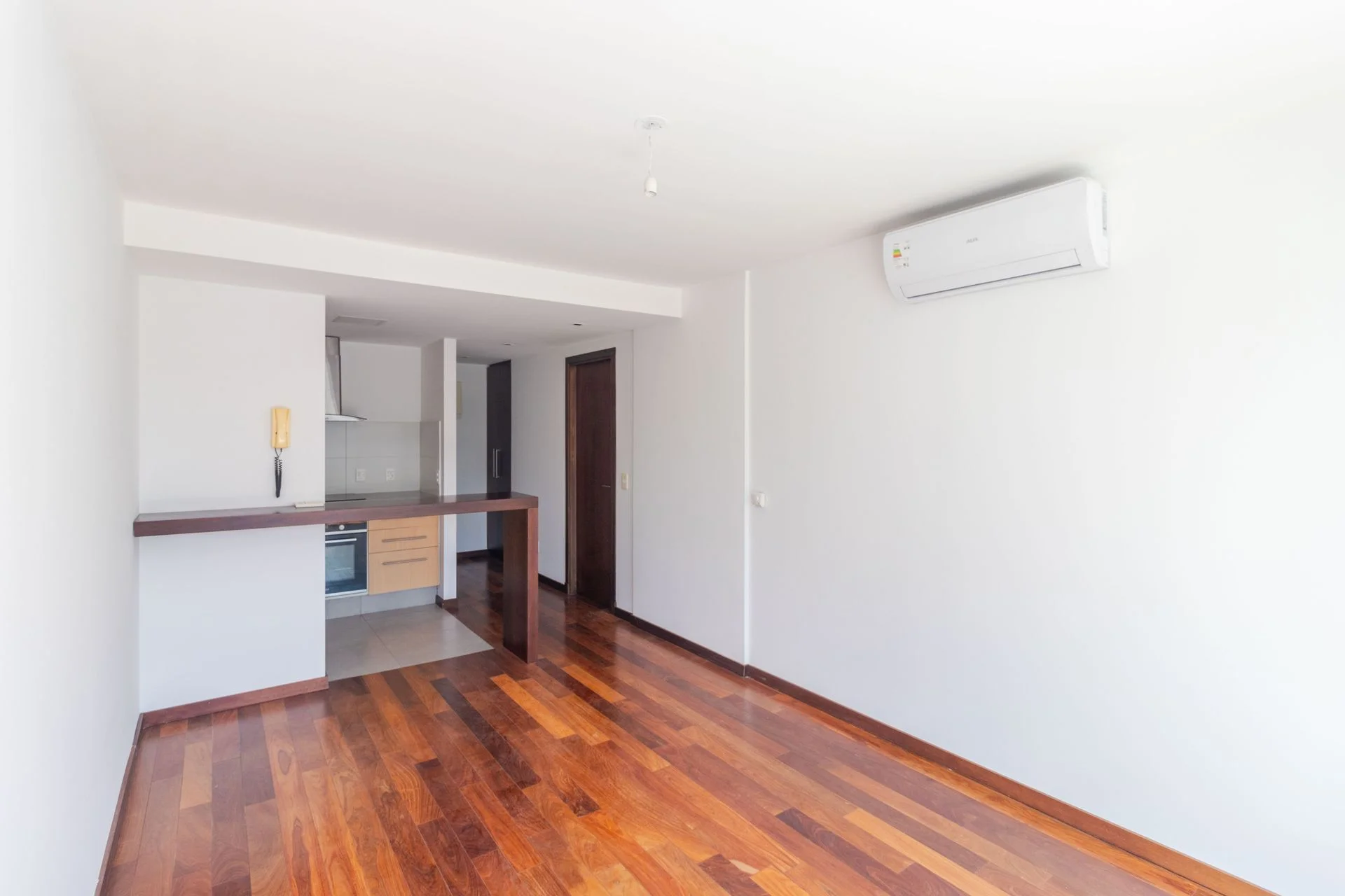 El edificio cuenta con 4 pisos, y el apartamento se encuentra en el 4º piso (unidad 403). Tiene 46mt2 (39mt2 interiores y 7m2 de balcón). Cuenta con un living comedor, con cocina integrada con una cómoda barra de madera. El living tiene un gran ventanal con salida a un amplio balcón, ideal para agregar un juego de mesa exterior. El living cuenta con aire acondicionado. El ventanal cuenta con toldo roller para el sol.