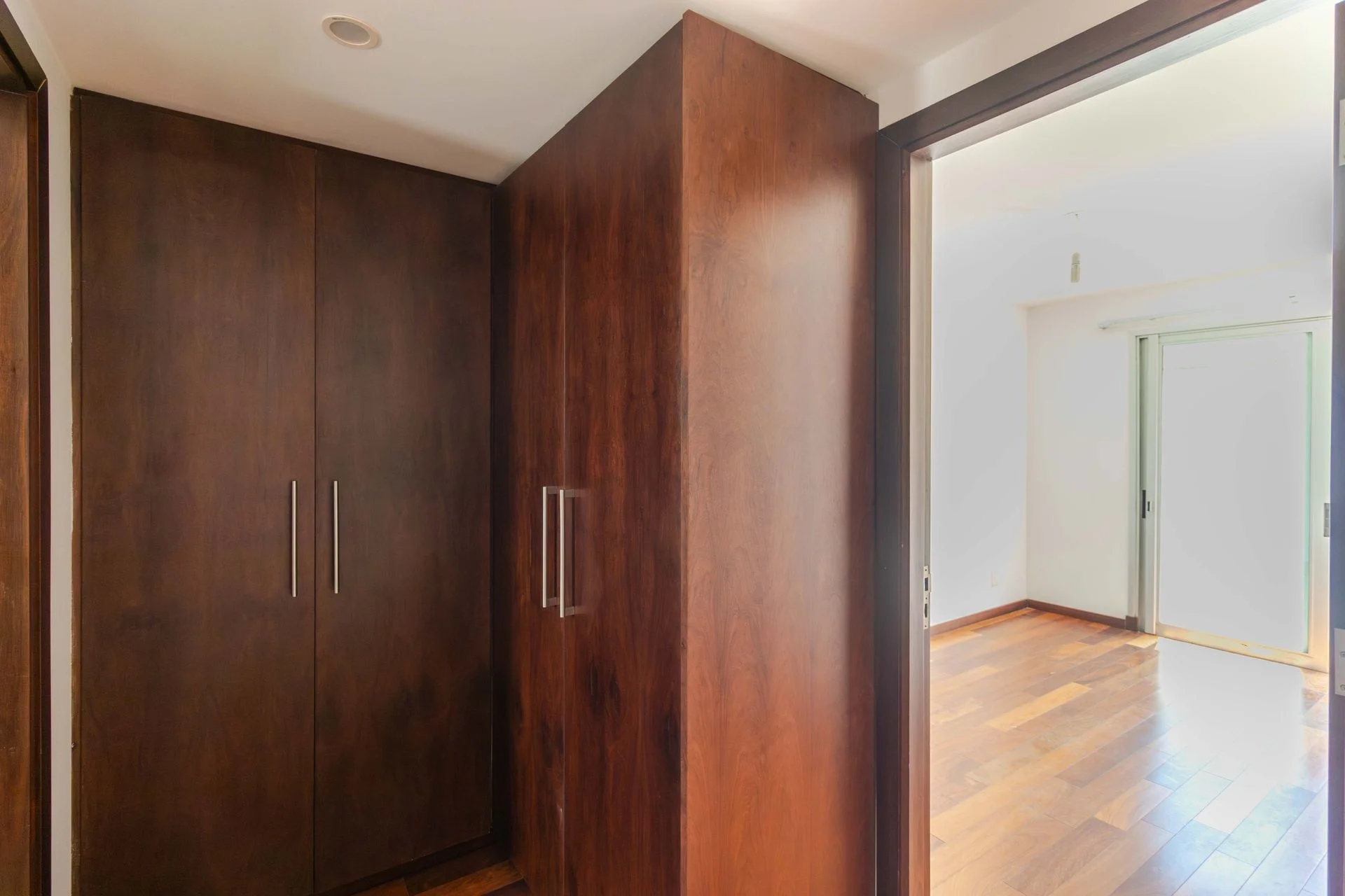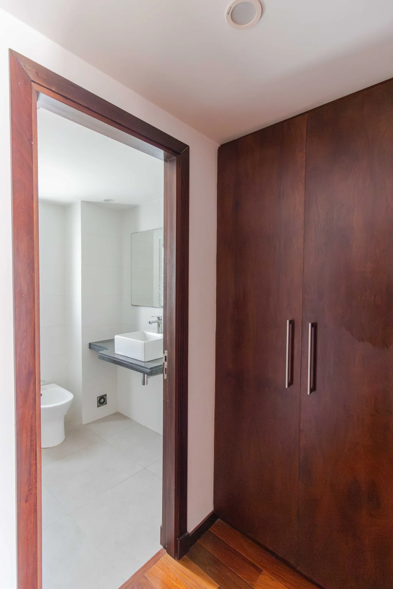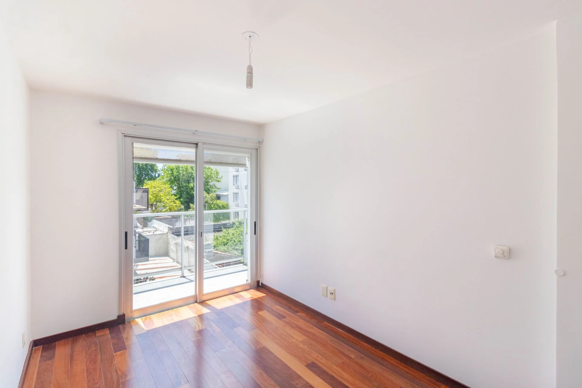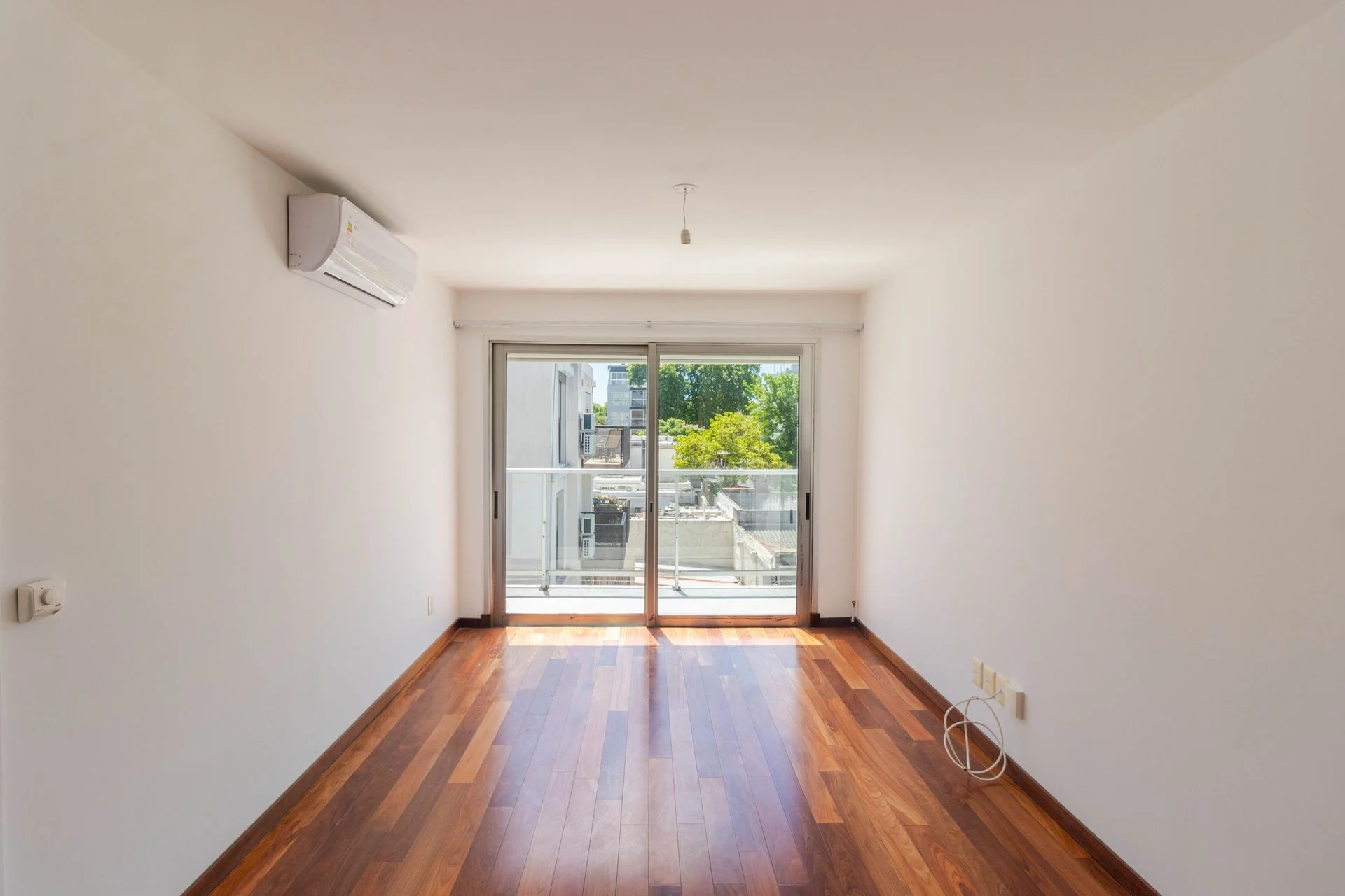 El dormitorio con gran ventanal también tiene salida al balcón que permite la entrada de luz natural y cuenta con aire acondicionado. Del dormitorio se accede a un vestidor con acceso a baño completo.