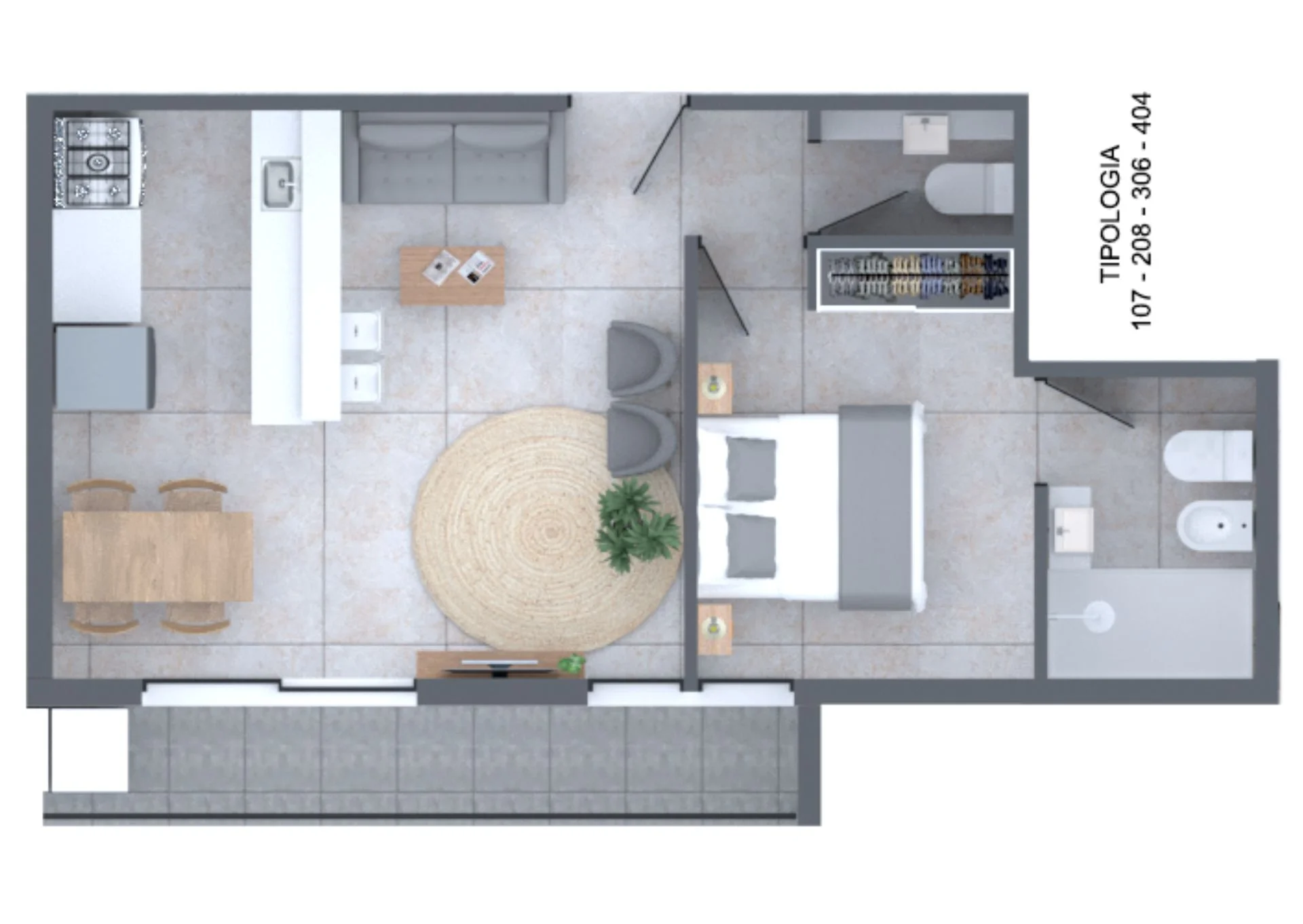 La unidad 107, es de 1 dormitorio con baño en suite y 1 toilette.