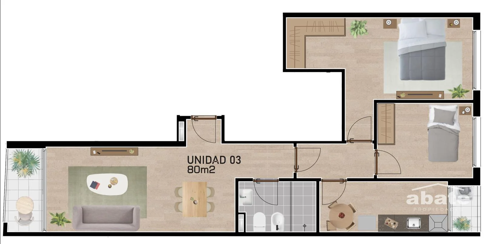 Unidades de 2 dormitorios incluyen: anafe vitro-cerámico y campana extractora de acero inoxidable y horno empotrado. Terraza al frente. Cocina definida con desayunador y segunda terraza lavadero. Placares completos.