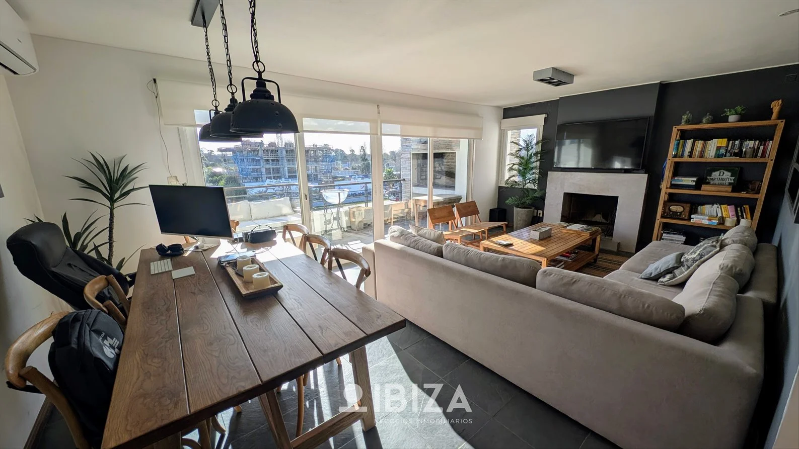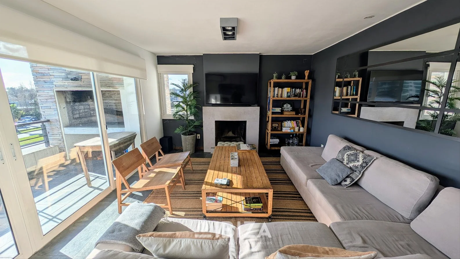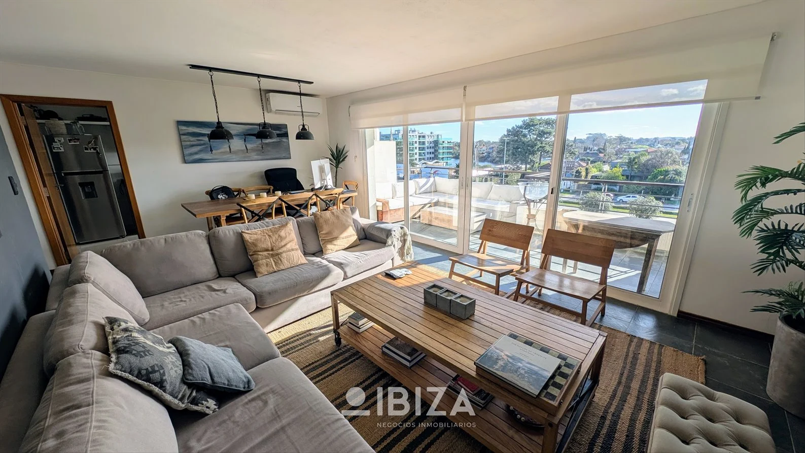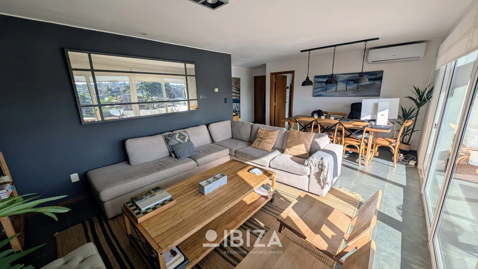 - Living comedor amplio y luminoso, con estufa a leña, aire acondicionado y acceso directo a la terraza principal con parrillero.