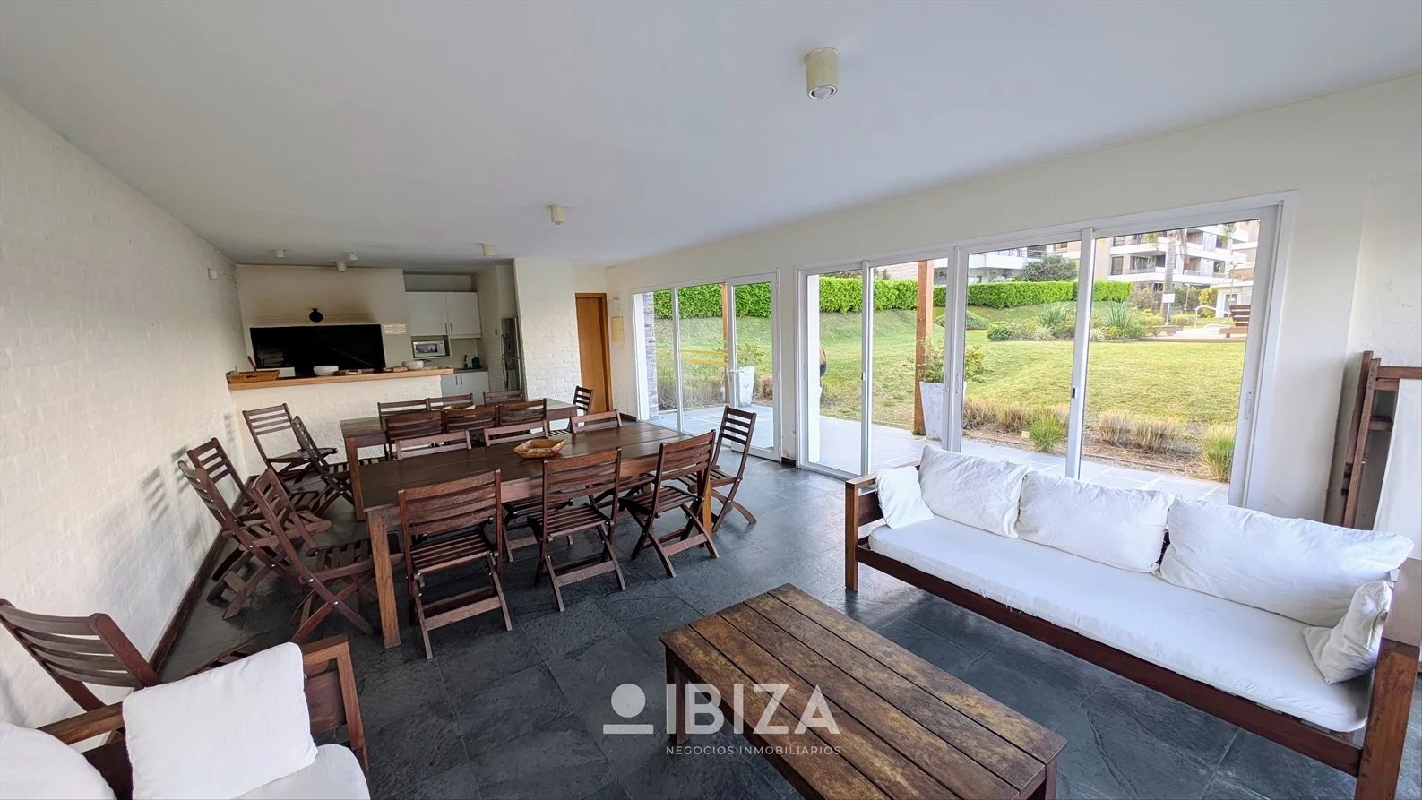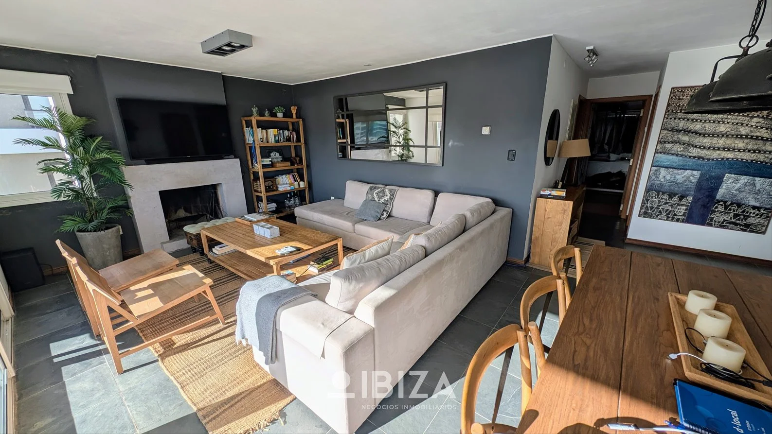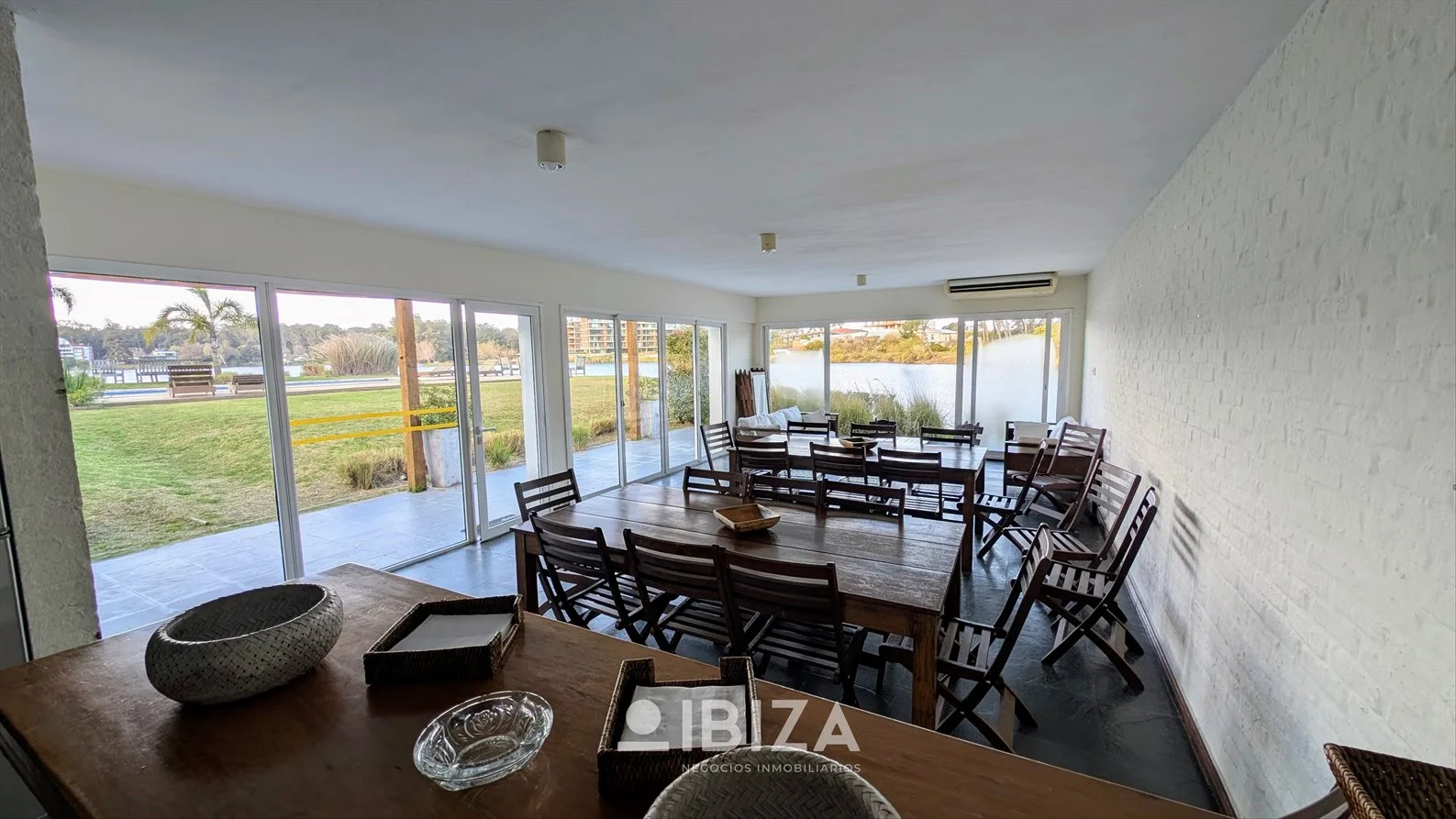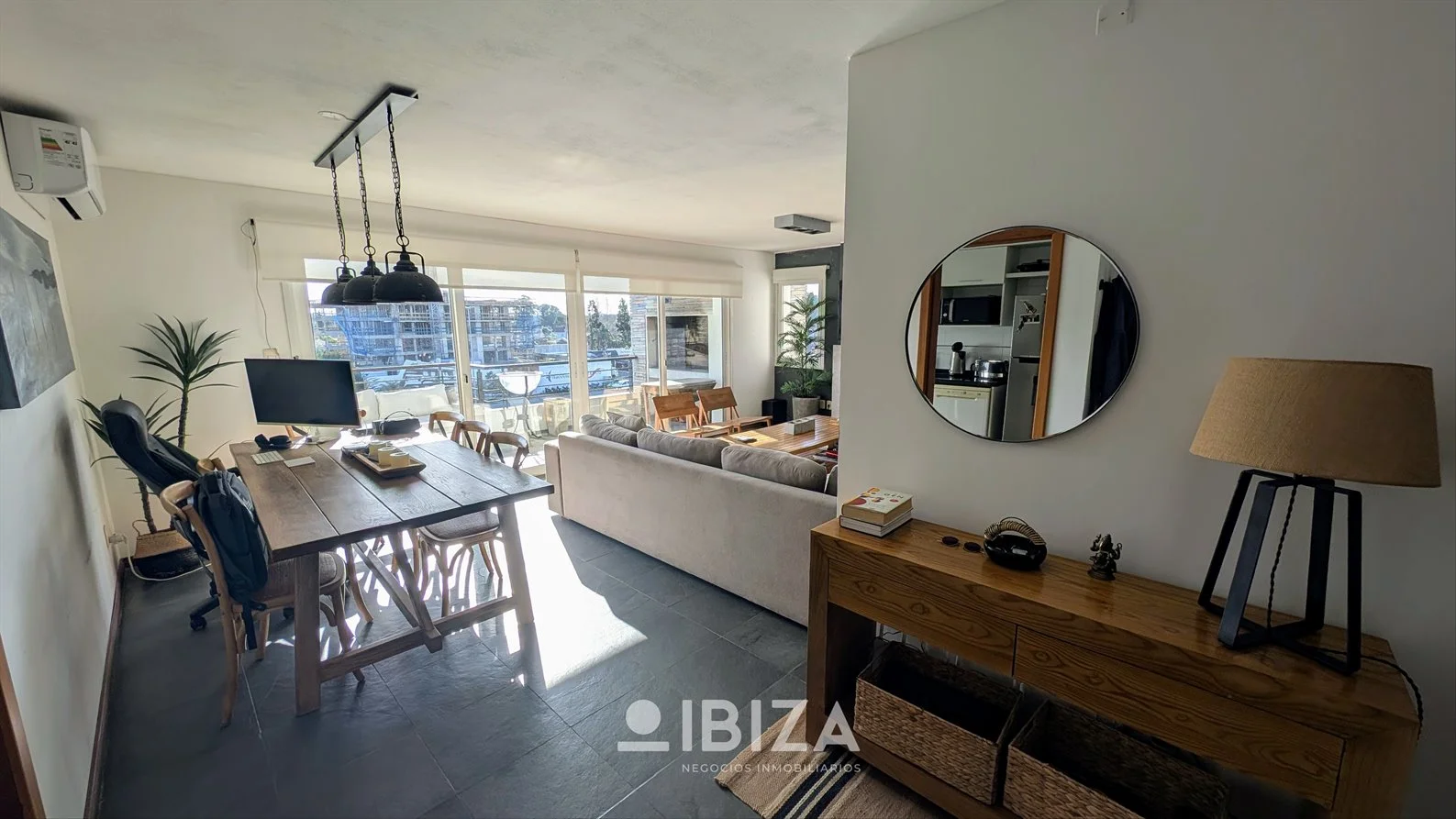 - Living comedor amplio y luminoso, con estufa a leña, aire acondicionado y acceso directo a la terraza principal con parrillero.