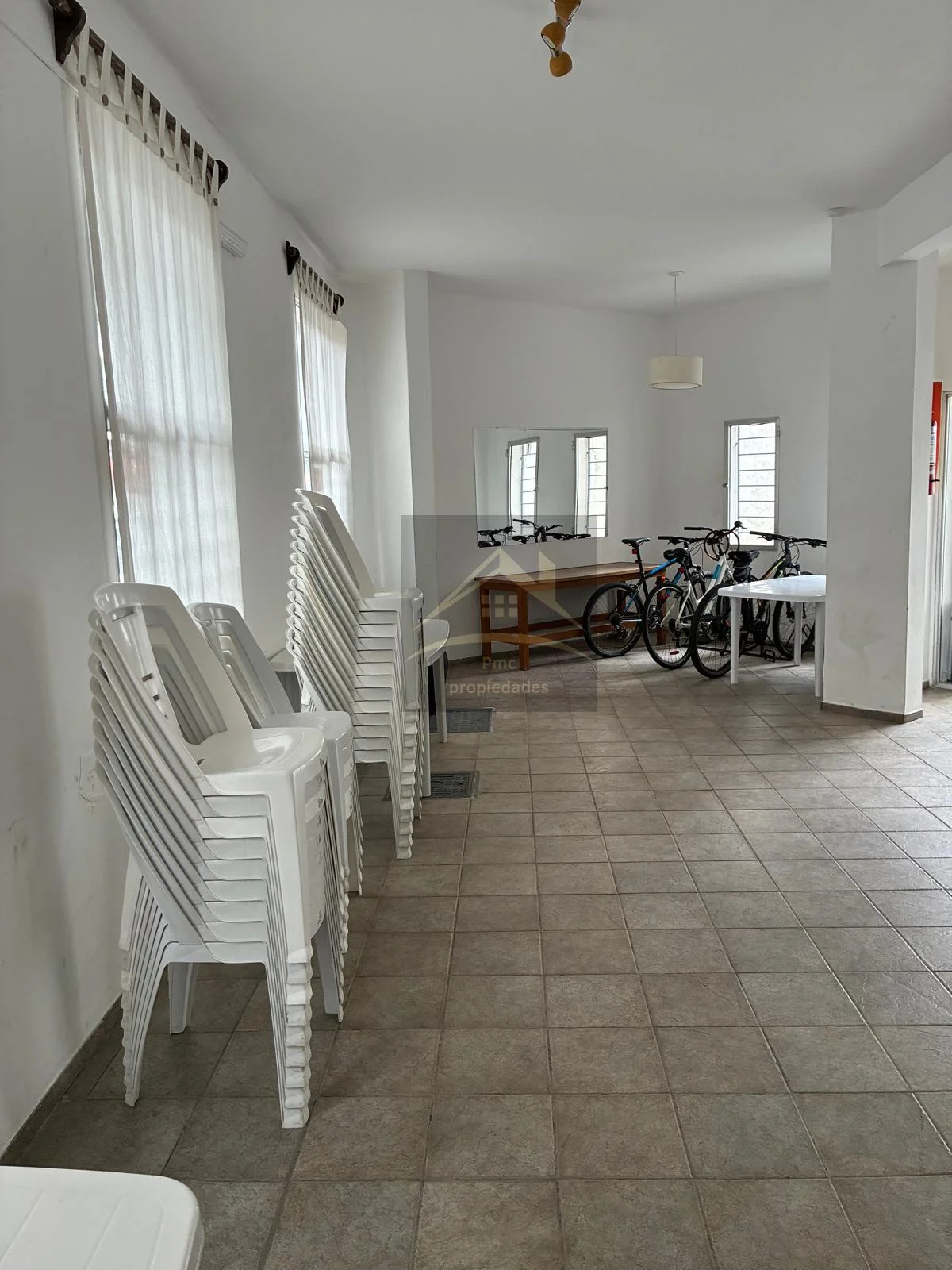 Dispone de sala de recepción en el edifico y barbacoa cerrada, muy amplia, con mesas y sillas, lugar de estacionamiento de bicicletas. Vajilla y cocina, con salida a patio de uso común.