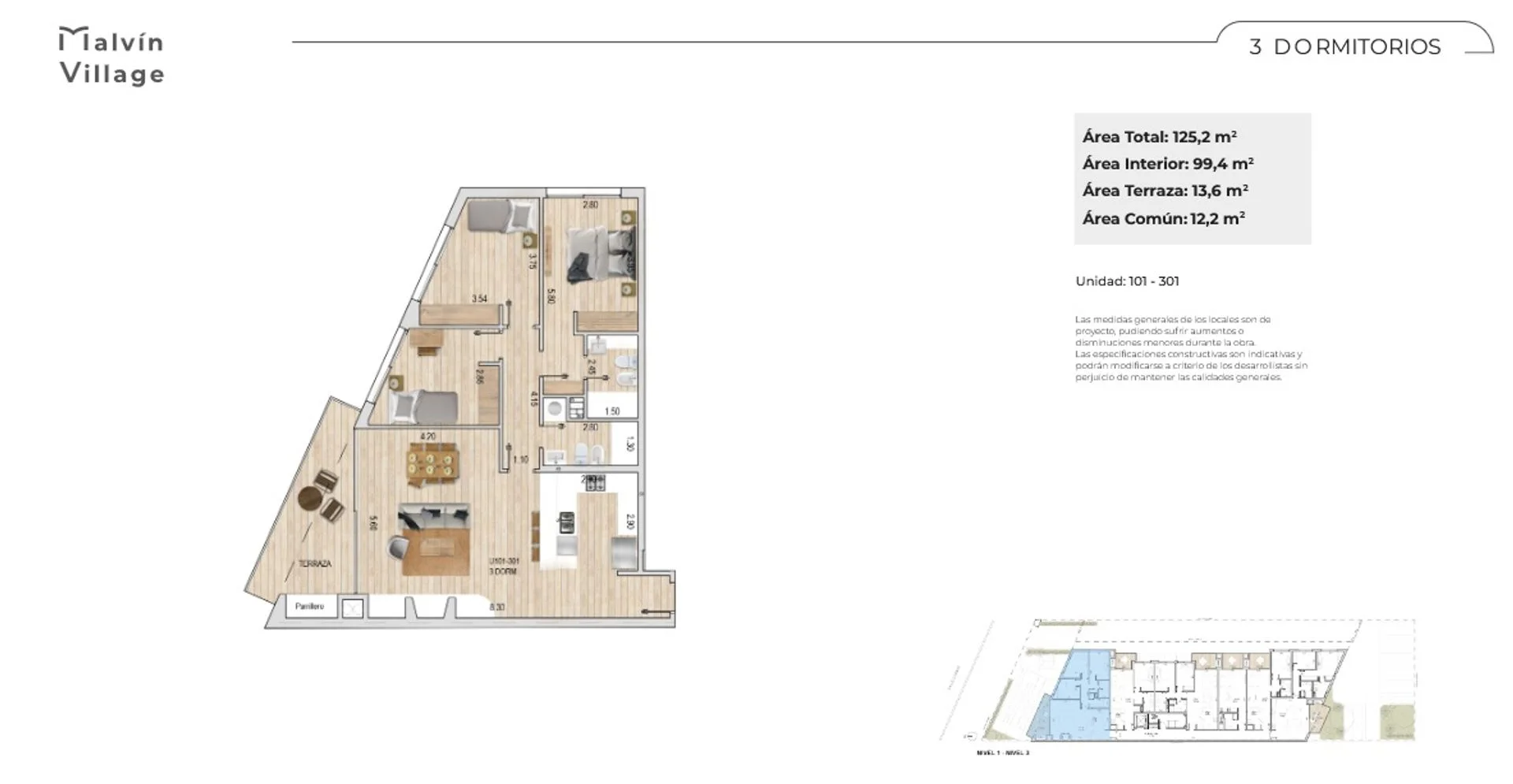 Se vende apartamento de 3 dormitorios en proyecto Malvin Village.
