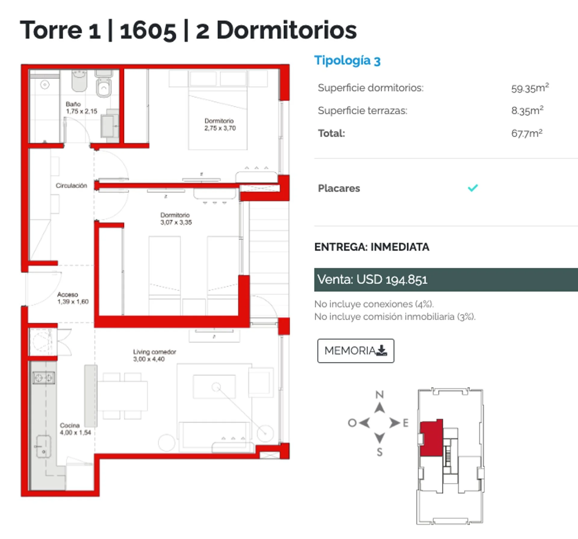 Unidad de 2 dormitorios, de 59 m2 cubiertos más 8m2 de terrazas