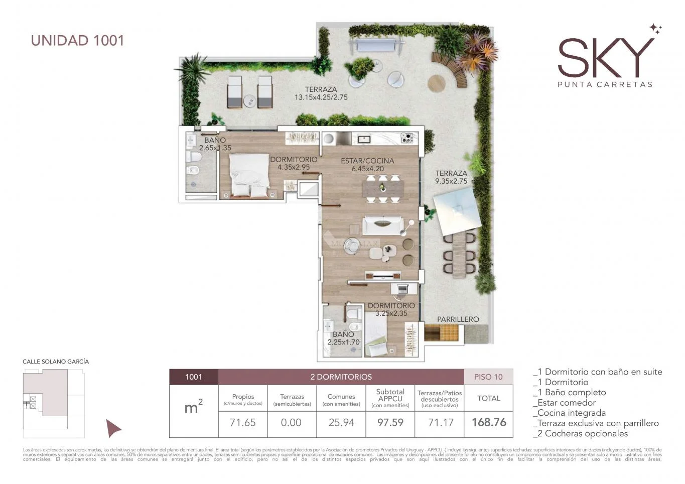 1001) 71,65m área propia + 71,17m terraza descubierta + 25,94m área común = 168,76m Total