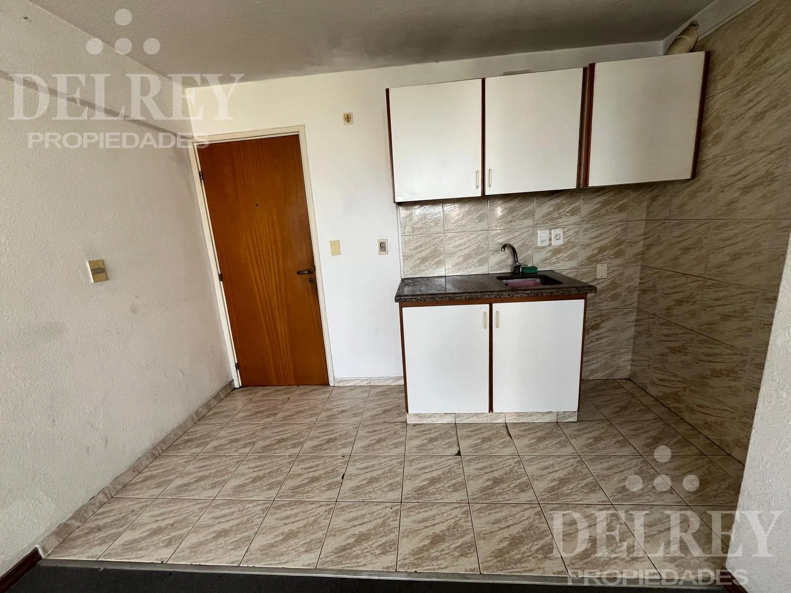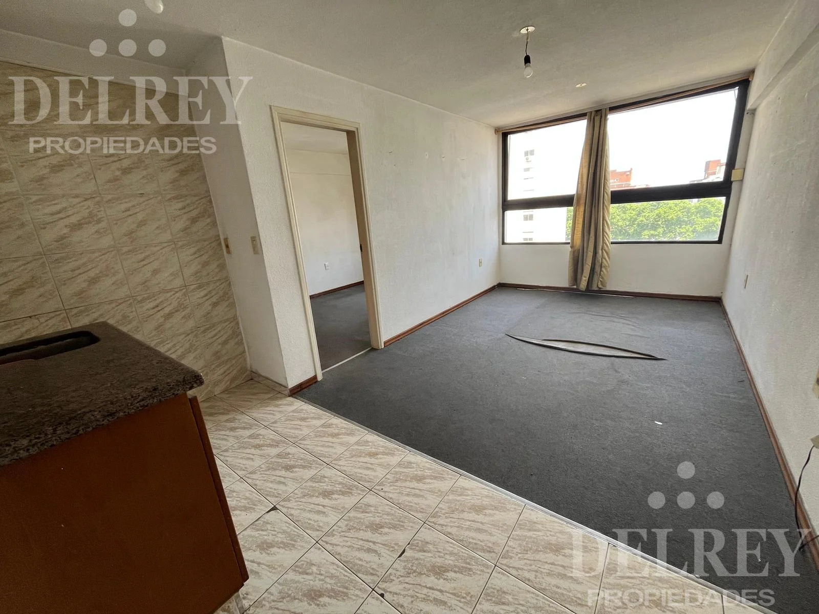 Living comedor cómodo con cocina integrada, mesada de granito y placares bajo y sobre mesada.