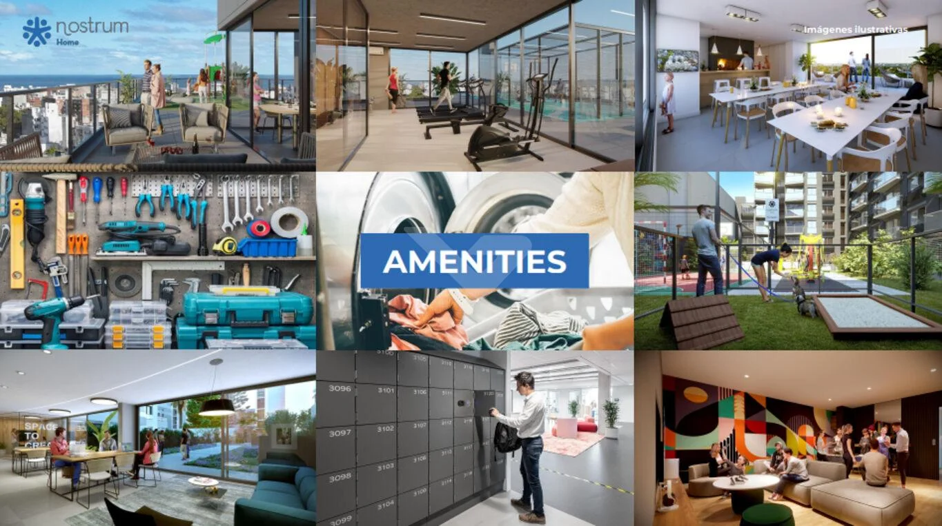 En planta baja se desarrollará un local comercial, smart lockers, sala de reuniones, un espacio de coworking, espacios exteriores enjardinados, área exterior con juegos infantiles, pet garden, estacionamientos techados y bike parking.