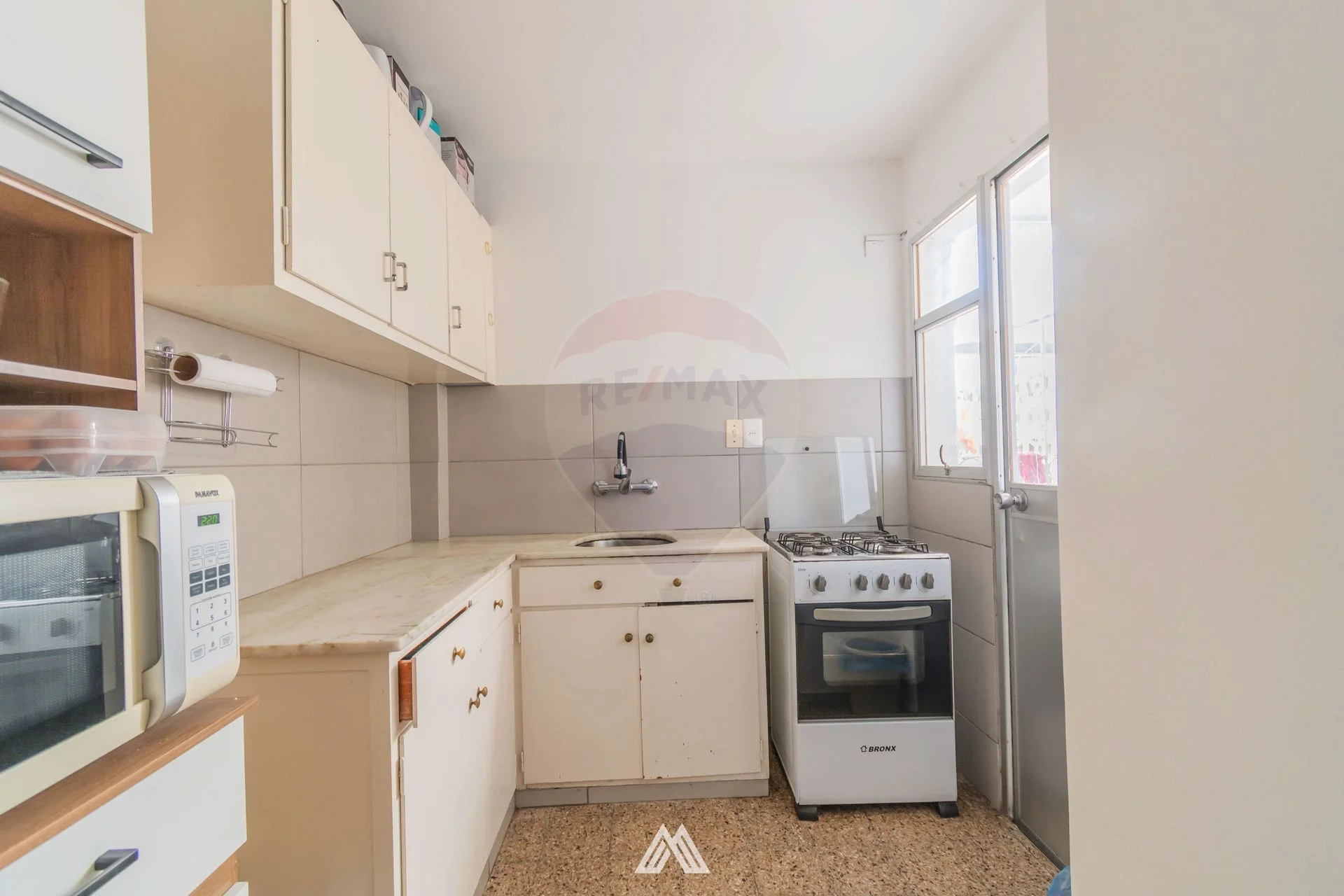 Hacia el fondo de la unidad se encuentra el baño completo, seguido por una cocina definida con doble mesada, buena capacidad de trabajo y distribución funcional. Desde la cocina se accede a la terraza de servicio y al patio de uso exclusivo, donde se ubica la conexión para lavarropas y el espacio para tendedero.