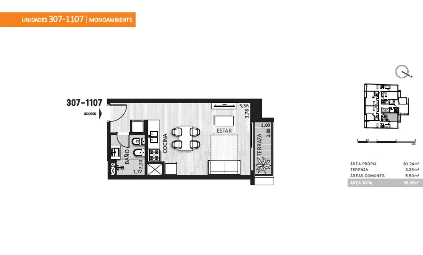 307 a 1107) 30,24m2 área propia c/muros + 5,50m2 área común + 3,25m2 terraza = 38,99m2 totales.