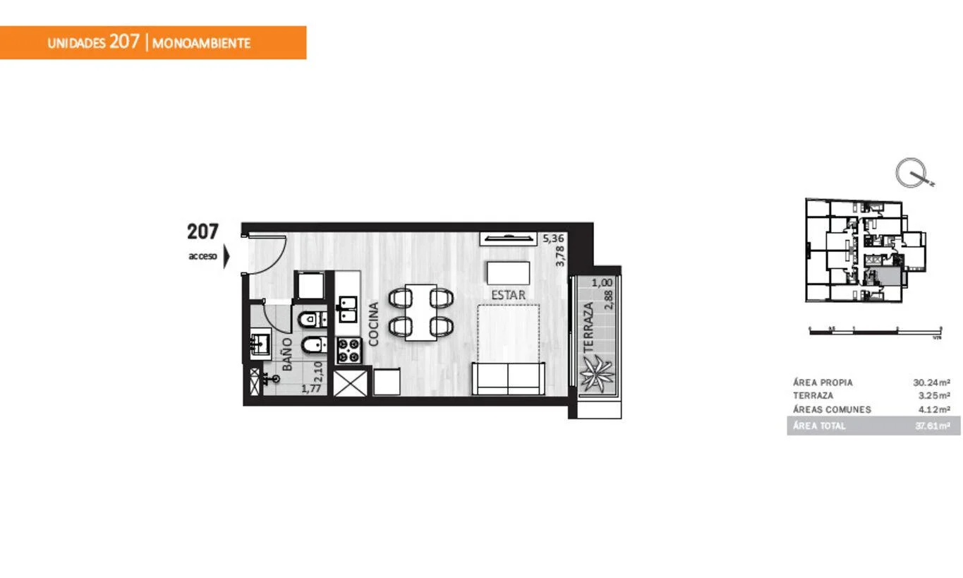207) 30,24m2 área propia c/muros + 4,12m2 área común + 3,25m2 terraza = 37,61m2 totales.