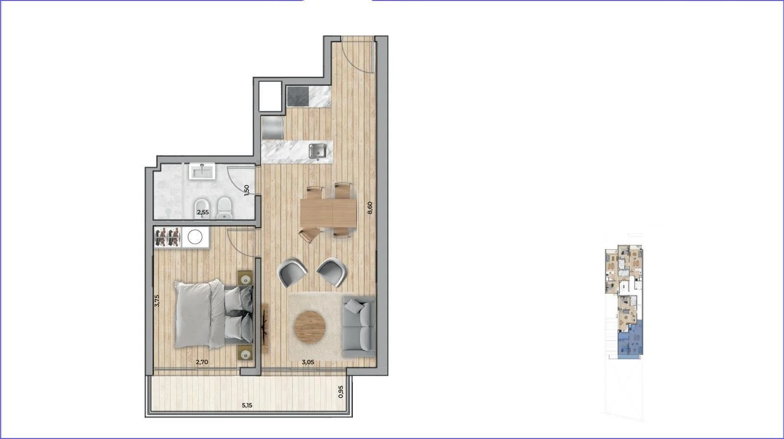 Living comedor con terraza, cocina integrada con placares sobre y bajo mesada, anafe, campana y termotanque, 1 dormitorio con placard, 1 baño completo.