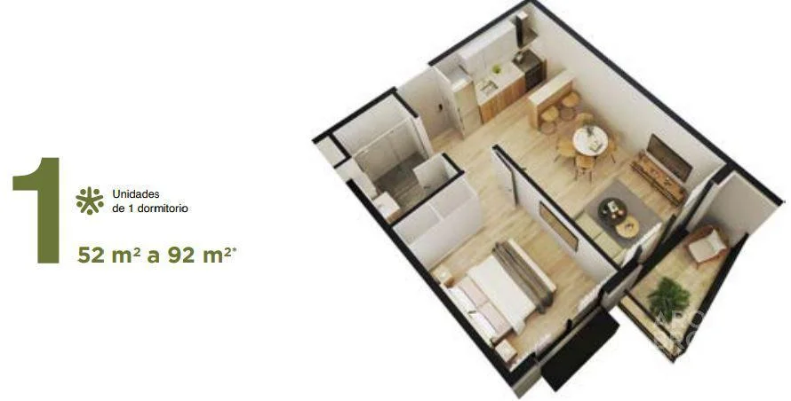 Living comedor con terraza, cocina integrada, 1 dormitorio y 1 baño completo.