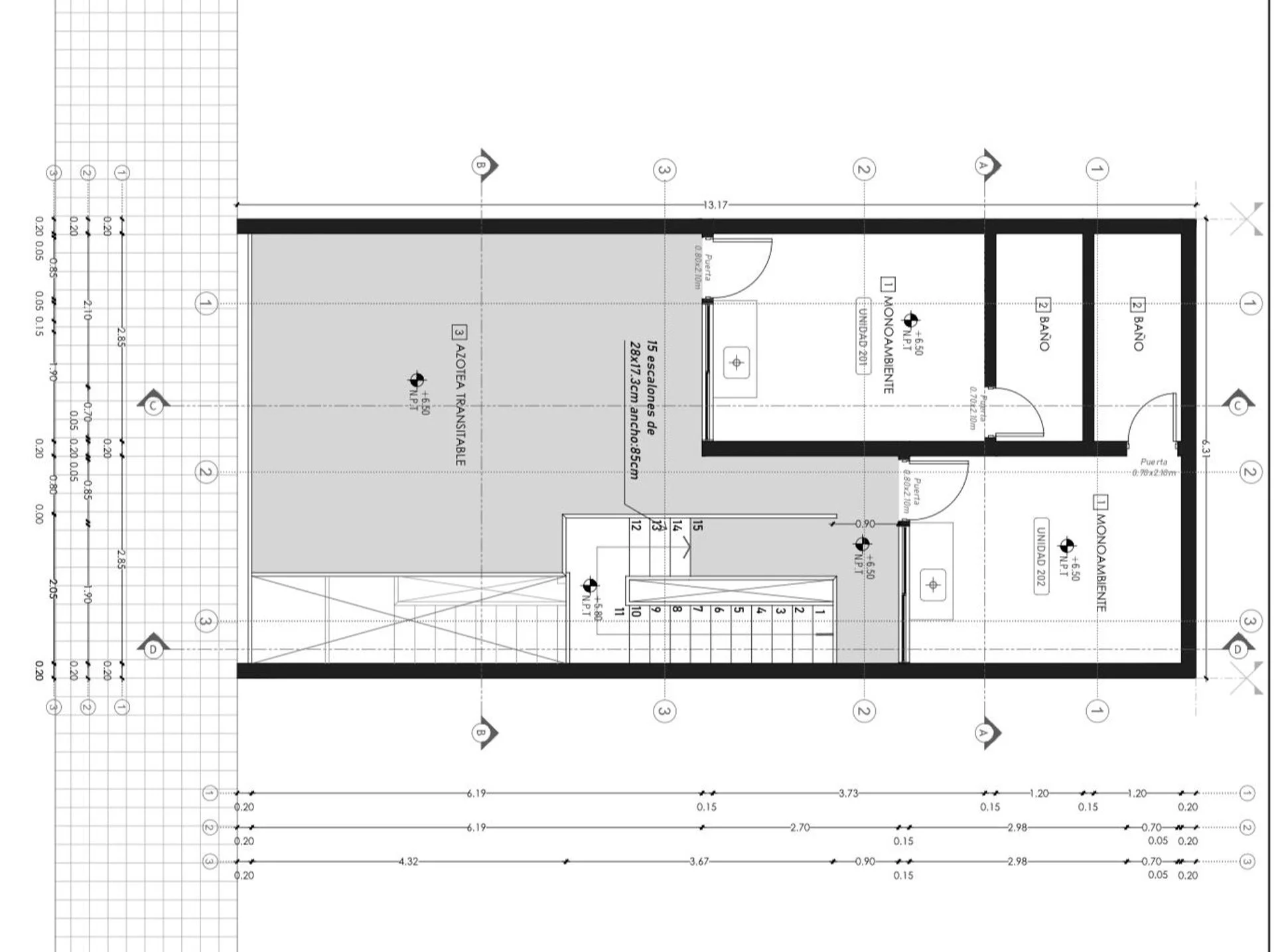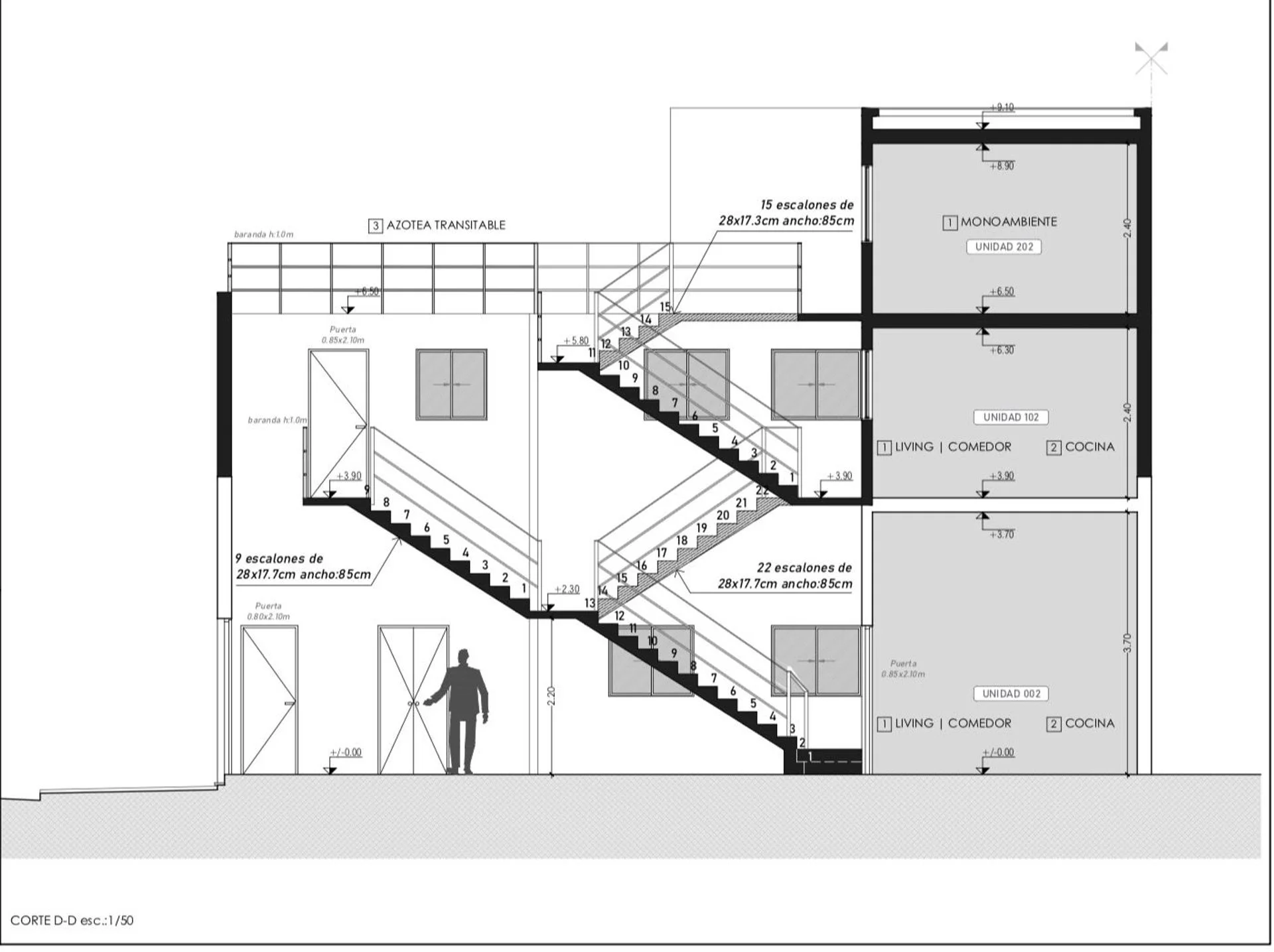 Último nivel: 2 monoambientes – 15 m² c/u, uno con patio de uso exclusivo