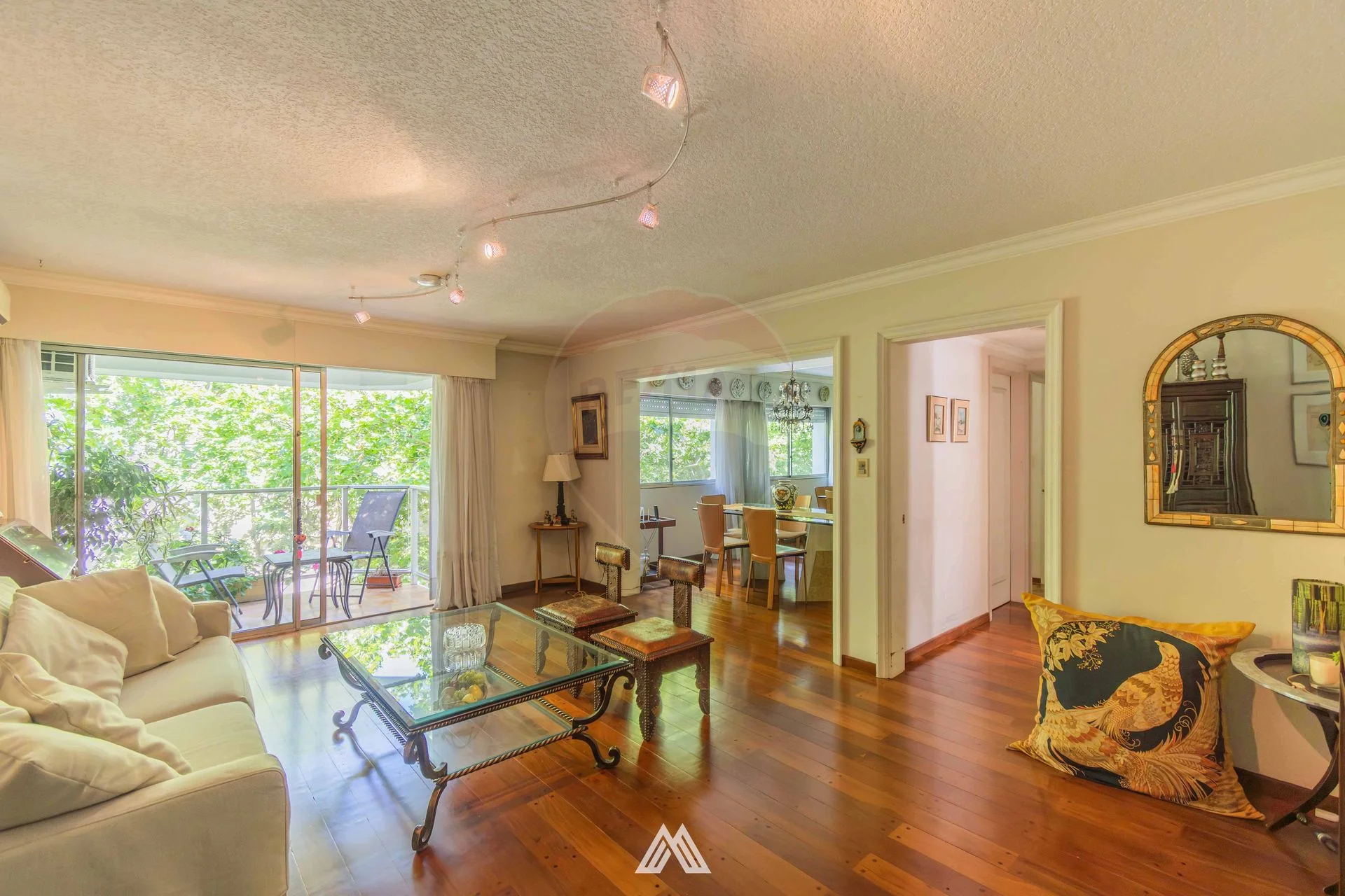 Se accede al living comedor, salida a amplio balcón al frente, pisos de lapacho tarugado, aire acondicionado, se encuentra integrado a área de comedor, que originalmente era el tercer dormitorio, y que fácilmente se puede volver a definir.
