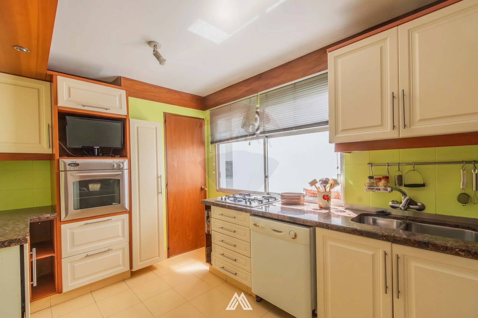 Cómoda cocina definida con office y luz natural, acceso de servicio y baño de servicio, caldereta para agua caliente central.