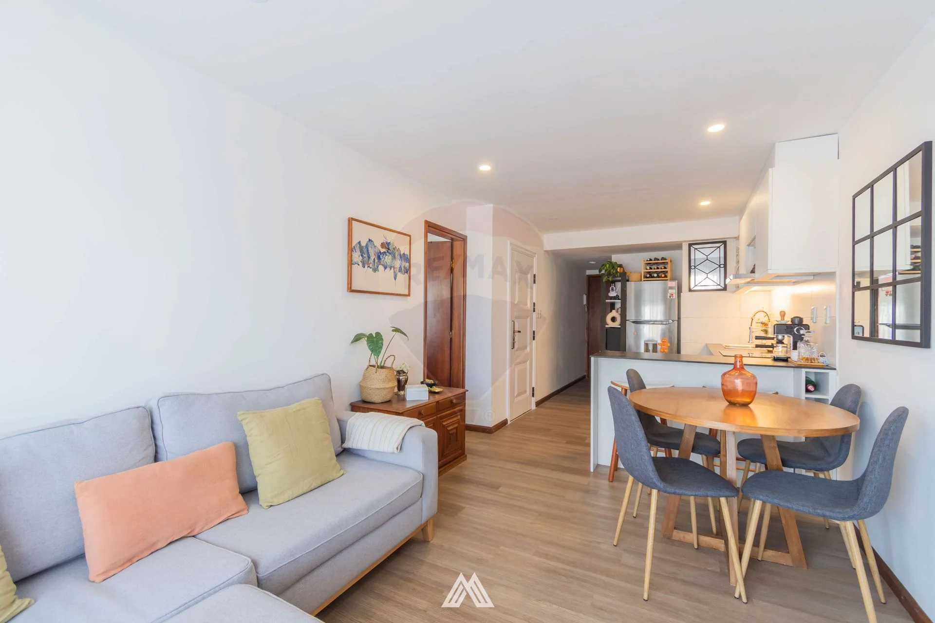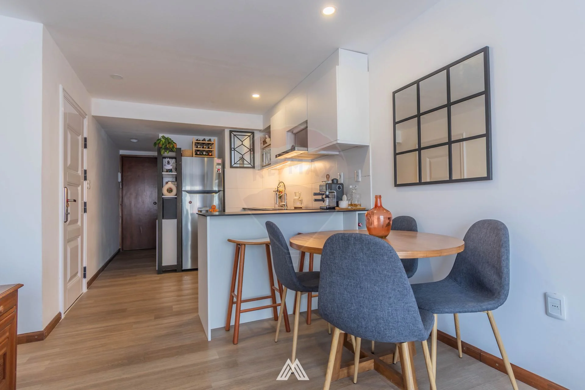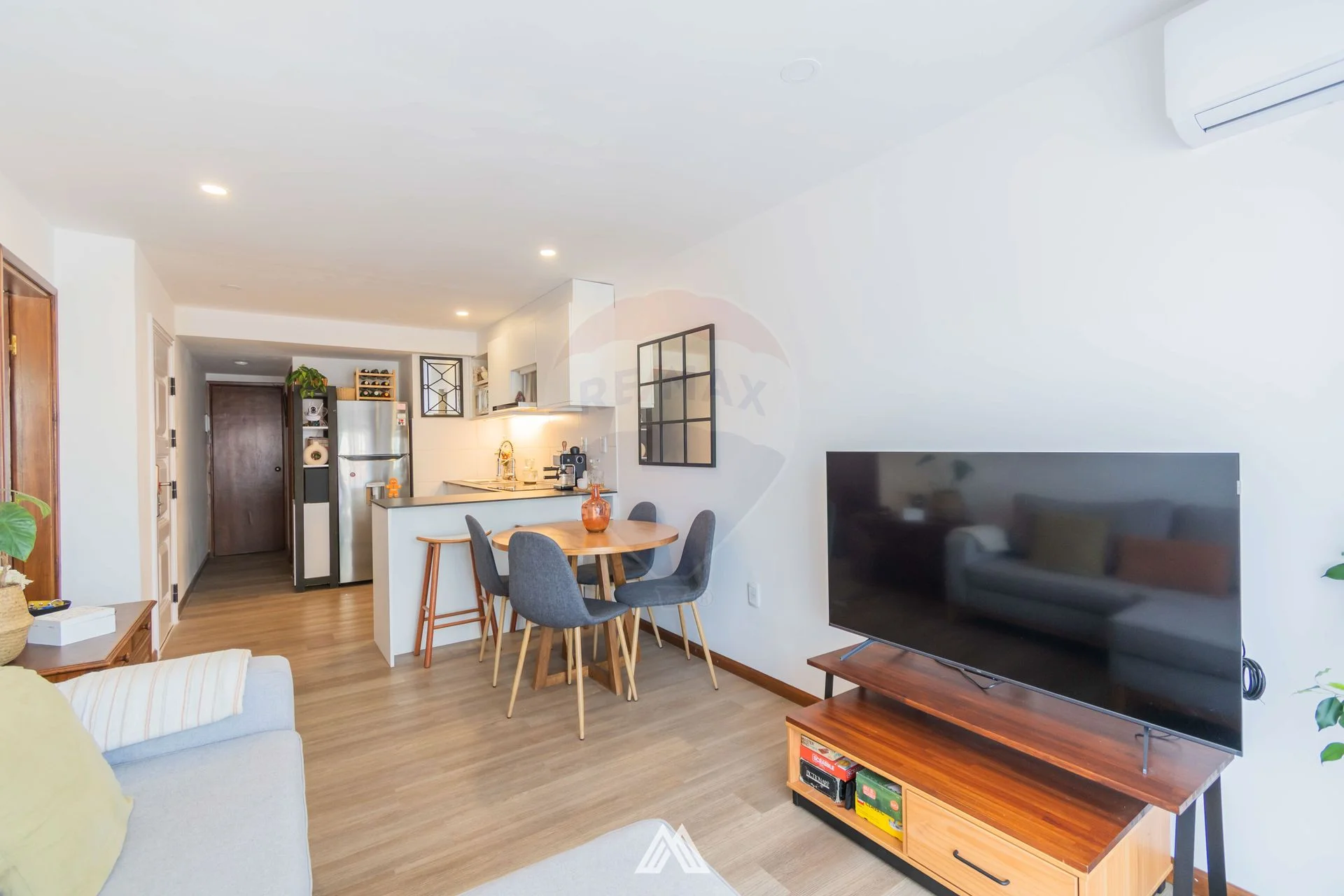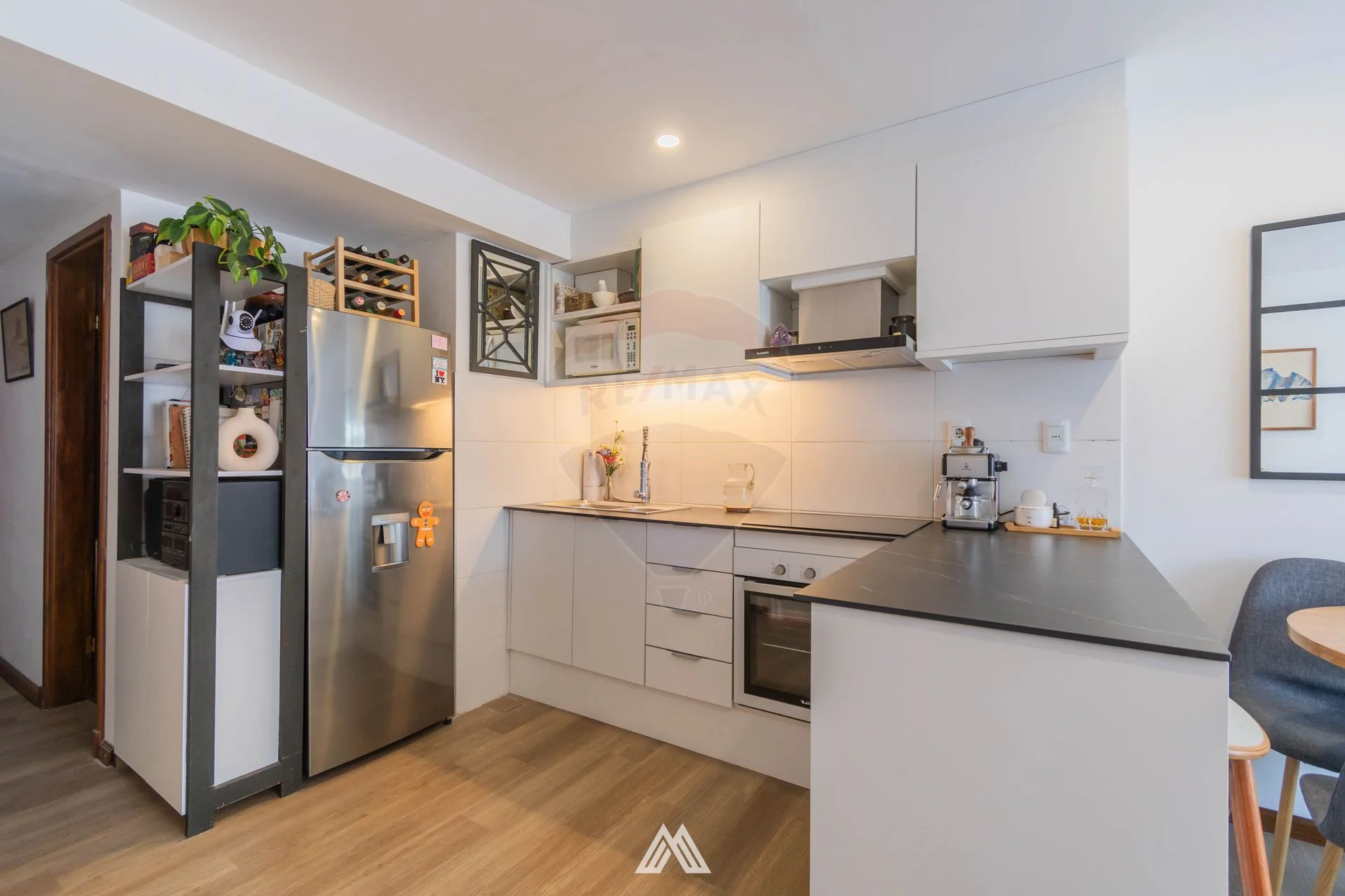 Sobre el acceso encontramos el área de living comedor con salida a terraza con orientación oeste, cocina integrada con buena área de apoyo, horno empotrado y anafe.