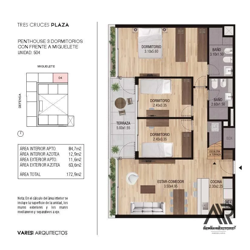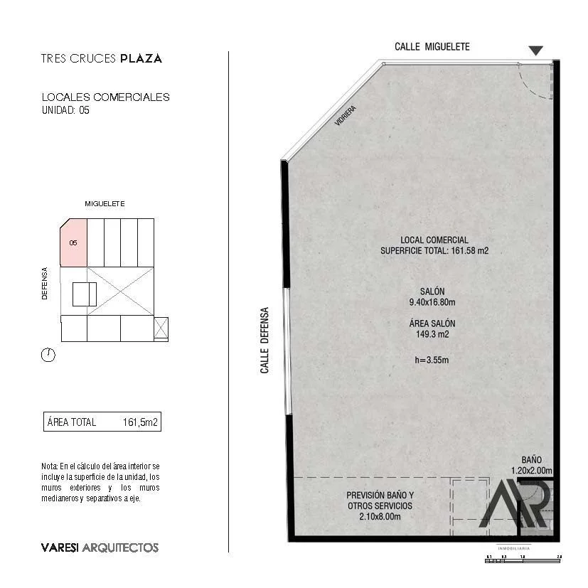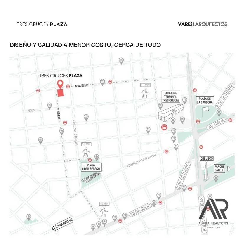 Edificio Tres Cruces Plaza se ubica en la esquina de Miguelete y Defensa con frente a ambas calles.