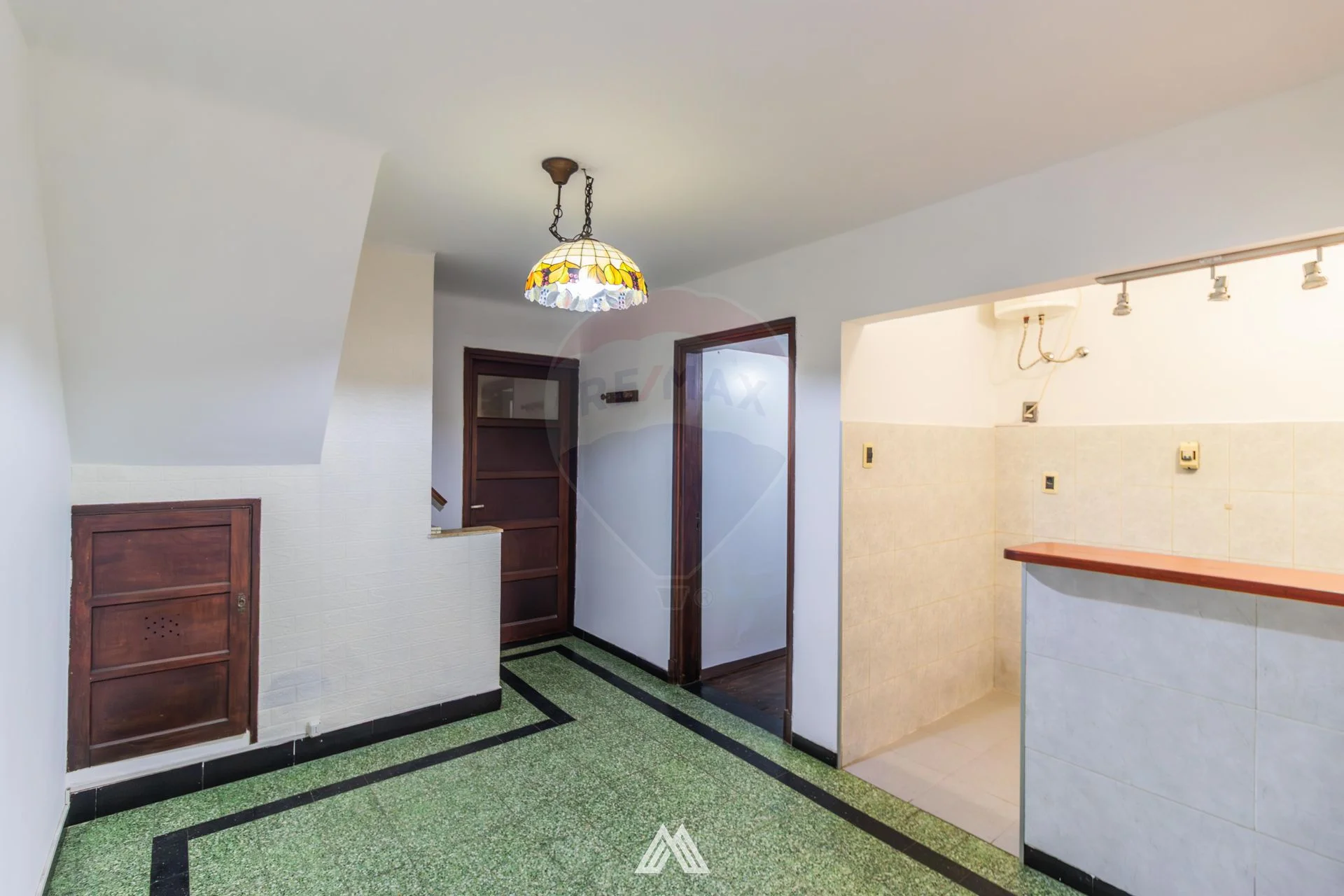 Living comedor, con piso de monolítico, con cocina semi integrada y escalera que conduce al escritorio.