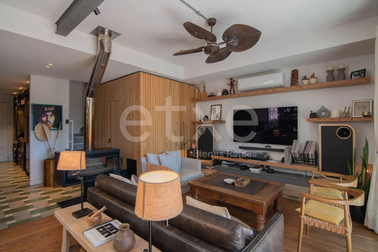Al ingresar, se accede a un pasillo recibidor que conecta con un amplio living-comedor al frente. A un lado, hay un estar con estufa de alto rendimiento, que se abre al patio, donde se extiende un deck con parrilla.