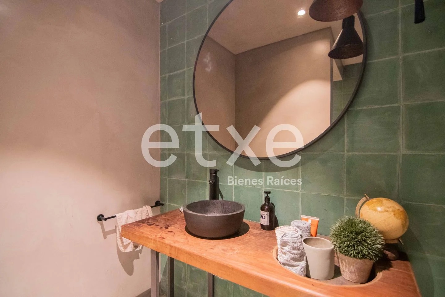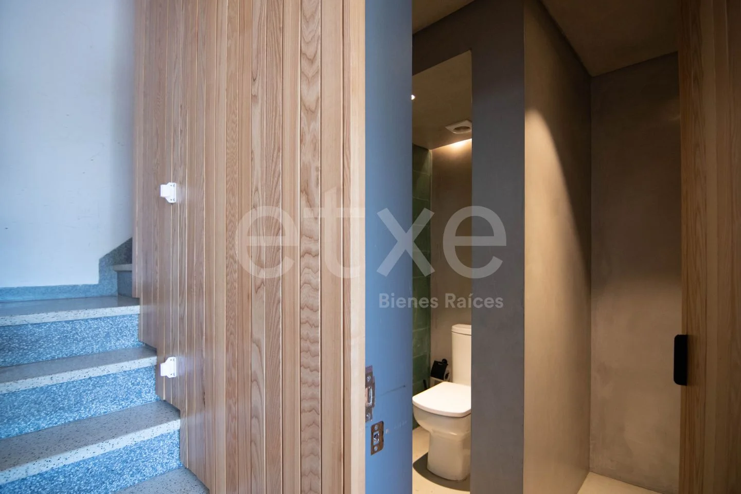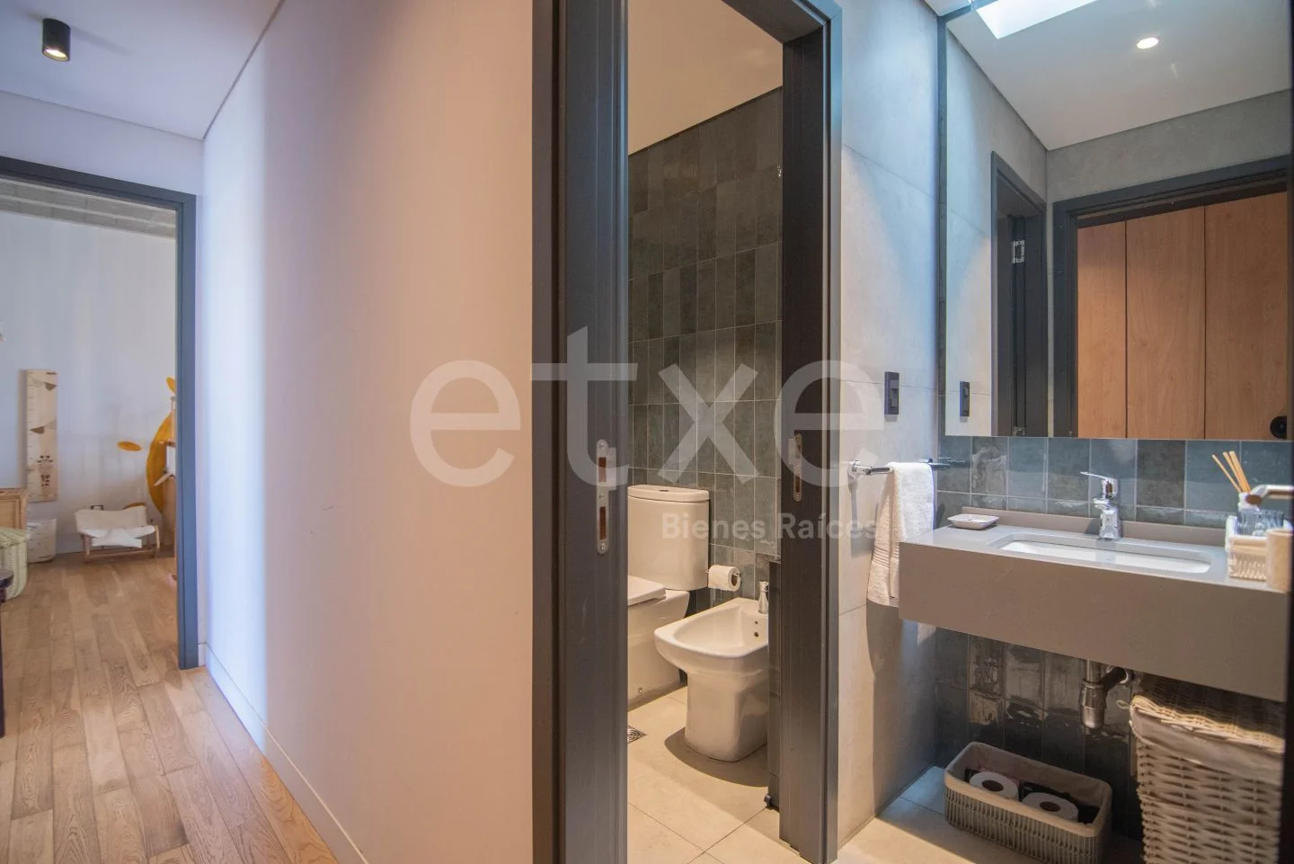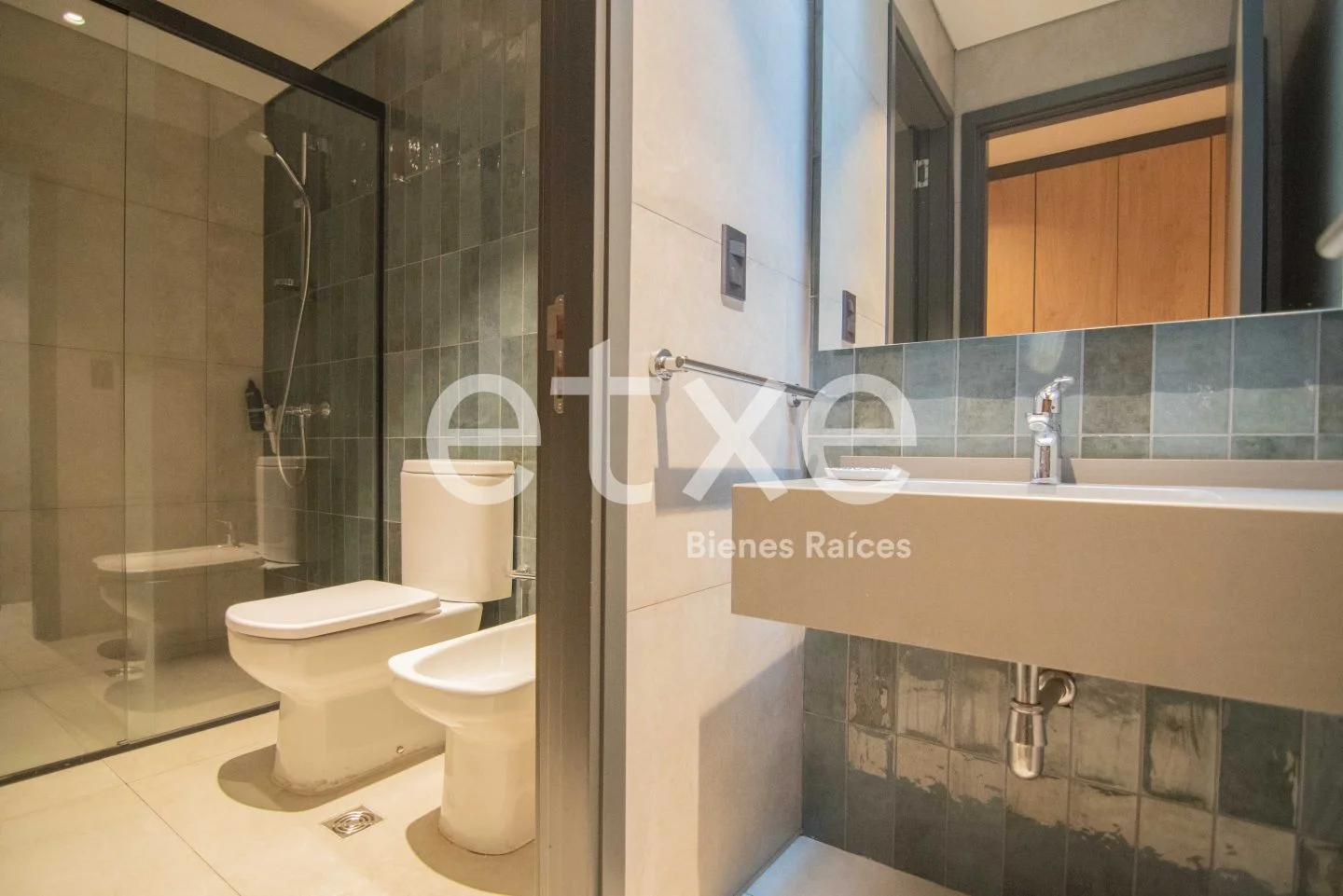 El baño social está compartimentado, separando lavabo e inodoro para mayor privacidad.