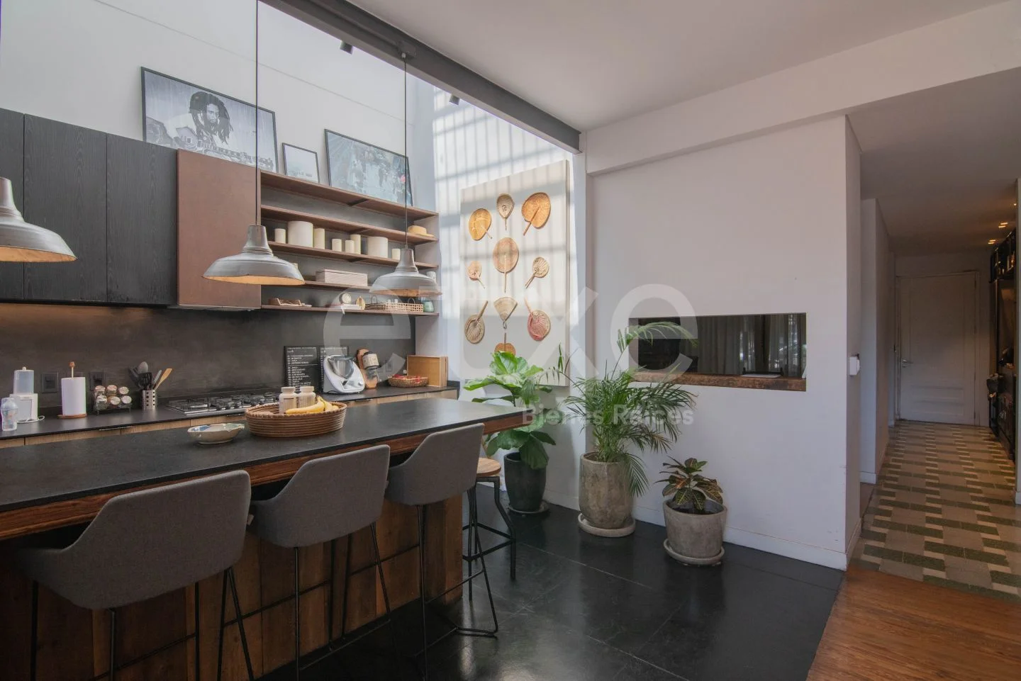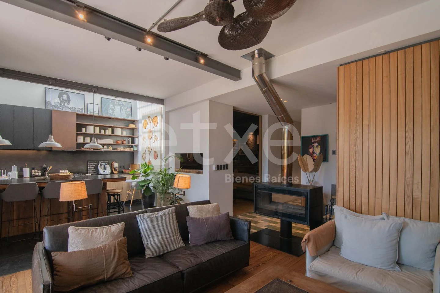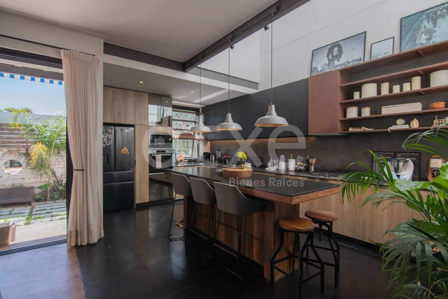 La cocina, integrada al estar, destaca por su diseño que articula los diferentes sectores de la casa. Se han utilizado materiales como piedra laja, microcemento, madera y hierro, que contrastan con las paredes blancas.