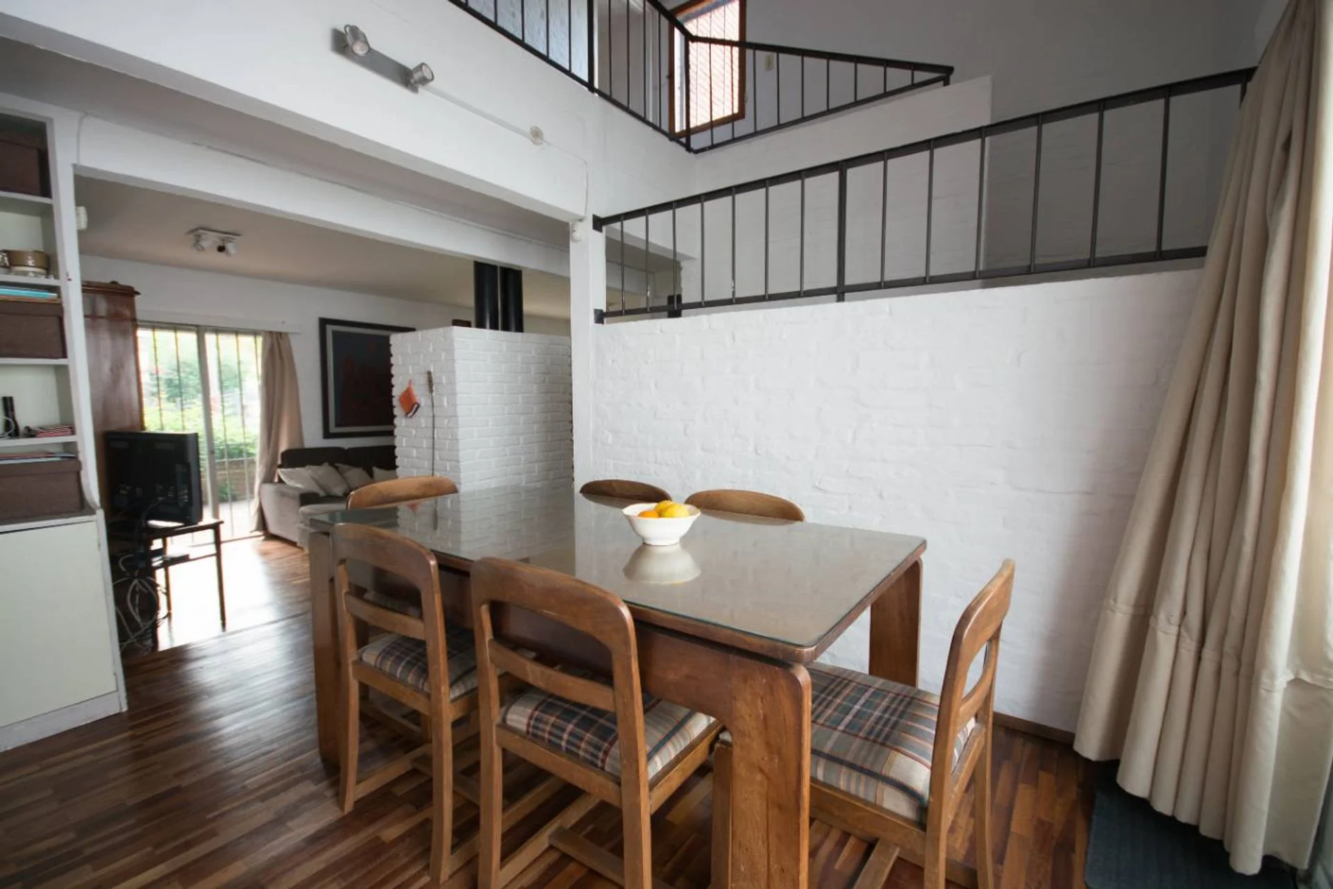 A la derecha, y separado por un desnivel (1 escalón), se encuentra el living con estufa a leña, piso de eucalipto y grandes ventanales con salida a la terraza.