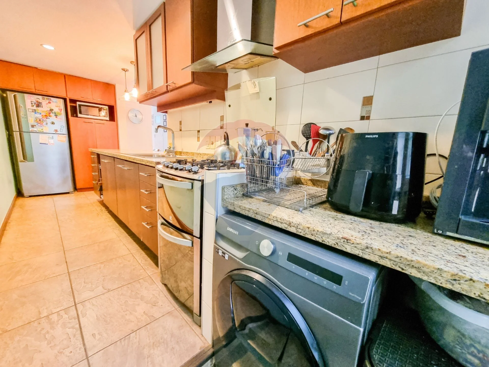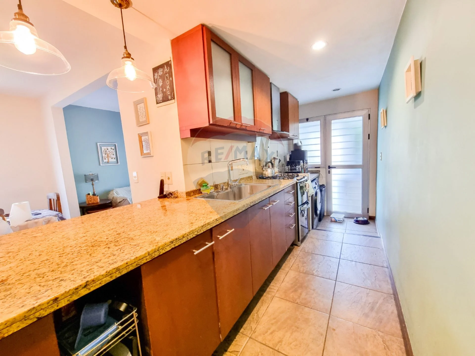 La cocina semi integrada con placares de buena madera y barra desayunador se conecta con el fondo,